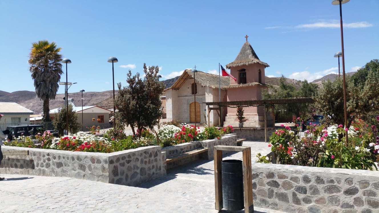 Montée progressive en suivant la vallée de la Lluta, comme le faisaient les voyageurs pré -colombiens. Les flancs des montagnes sont gravés de géoglyphes représentant des hommes et des animaux : lama, puma et même un singe, attestant d’échanges avec l’Amazonie. Ici, petit arrêt dans le village de Poconchile devant une église en adobe, très ancienne. (La photo des géoglyphes est pour le moment dans l’appareil photo et arrivera plus tard)