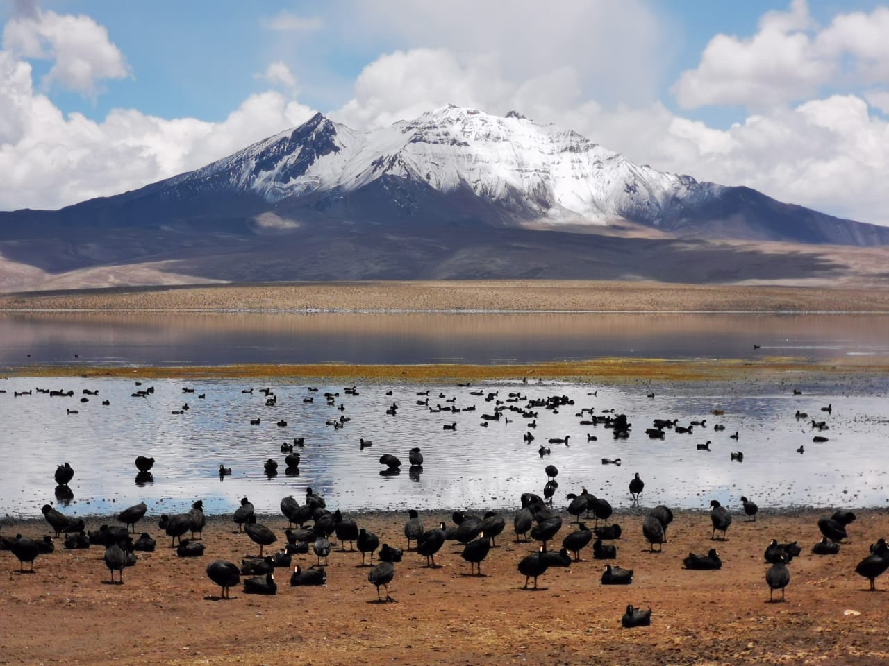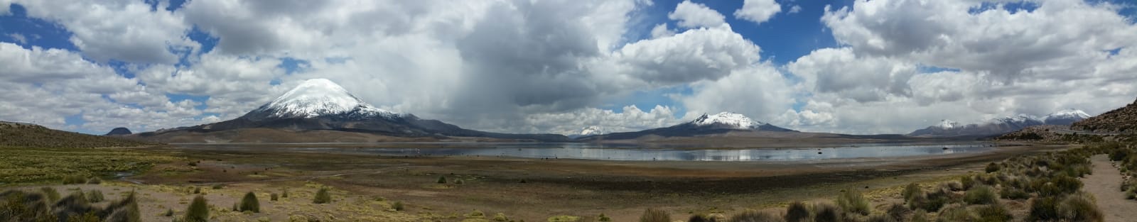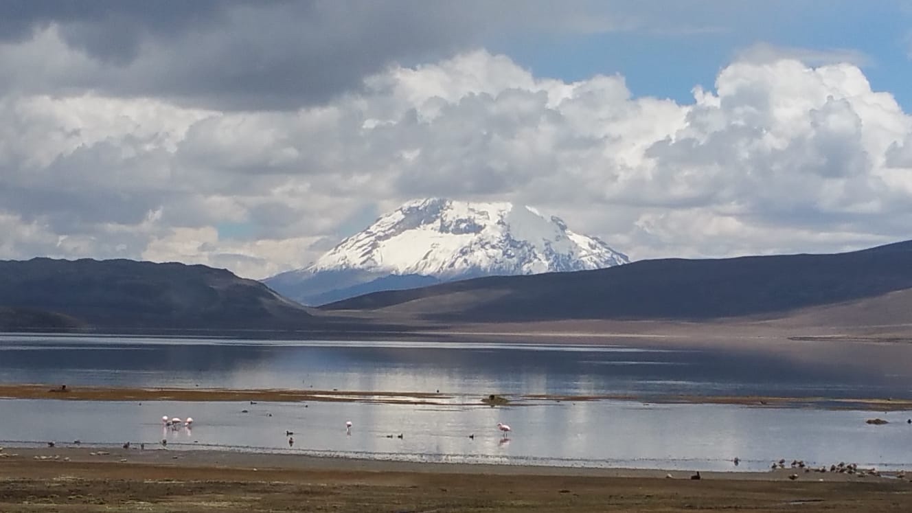Plusieurs volcans dominent les hauts plateaux et le lac Chungara , le plus haut du monde à une altitude de 4517 m; le volcan Parinacota atteint 6342 mL’un des volcans est actif, émettant des fumées difficiles à distinguer des nuages qui s’accumulent avant la prochaine pluie. Le tonnerre gronde