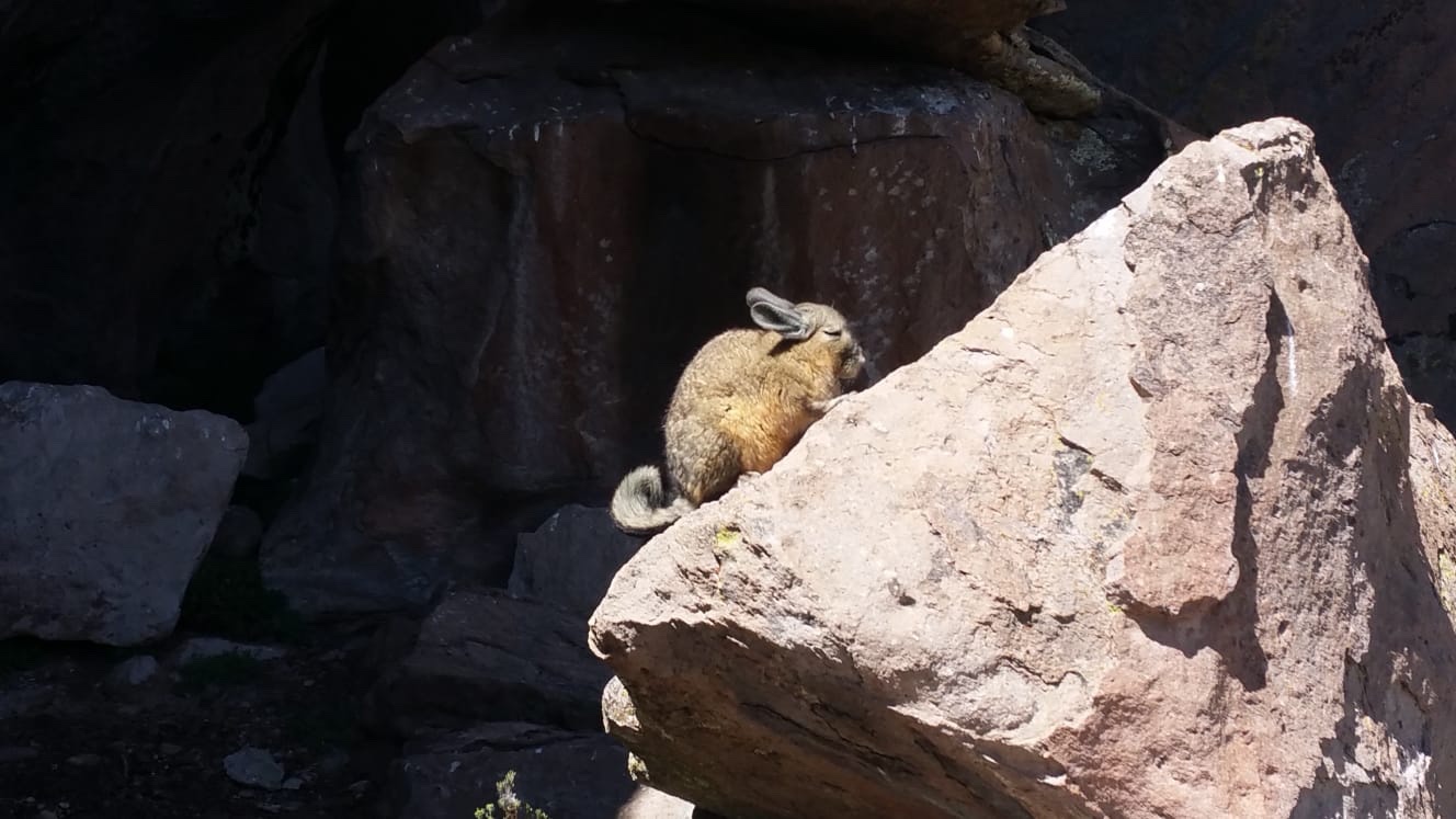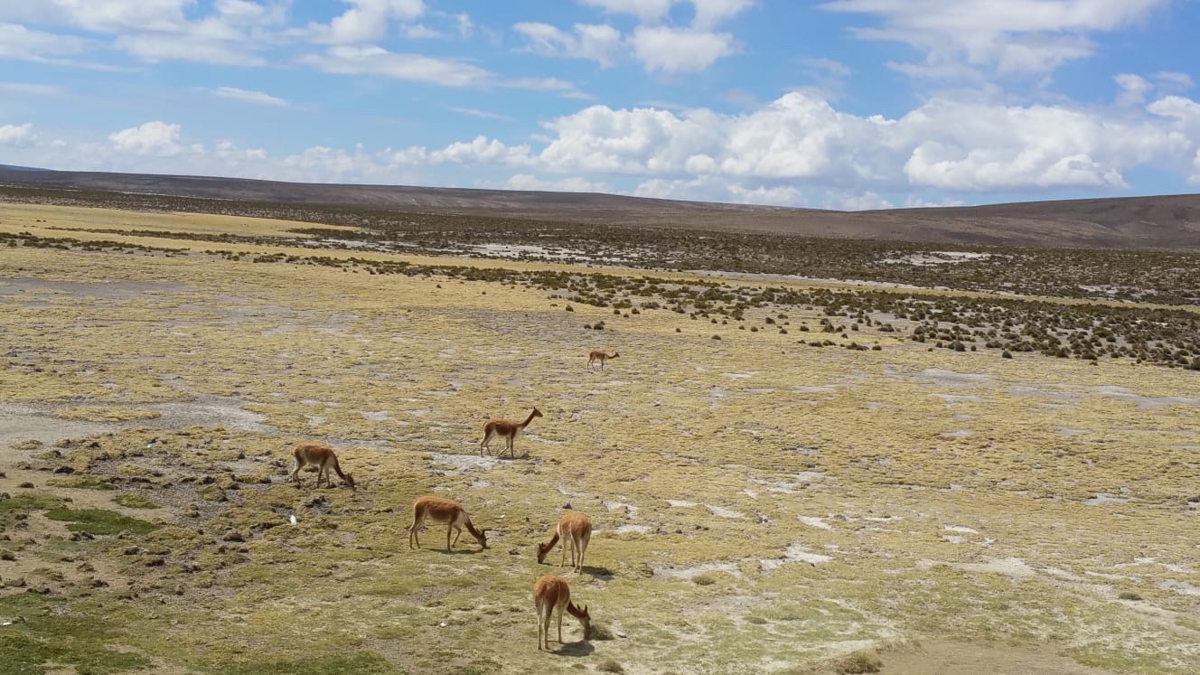 Arrivée sur le puna ou Altiplano. L’agriculture devient impossible car le temps est instable et peut devenir très froid. Mais des animaux y vivent dont certains peuvent être domestiqués.De vastes étendues d’eaux peu profondes sont recouvertes de moussesDes rochers et grottes ont servi d’abri aux bergers des hautes altitudes depuis la pré histoire. Aujourd’hui ces grottes servent de refuge à un cousin du chinchilla gros comme un lapin : le vizcachaDes vigognes apprécient les mousses rases qu’elles trouvent dans ces zones humidesL’Altiplano est aussi propice à l’élevage des alpagas, espèce obtenue par sélection à partir de vigognes par les incas. Les alpagas peuvent être tondus et y survivre, contrairement aux vigognes qui meurent de froid si on leur retire plus de 200g de laine par animal