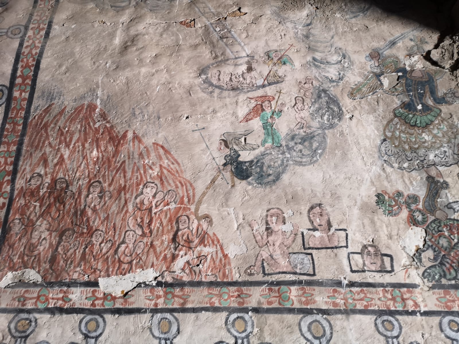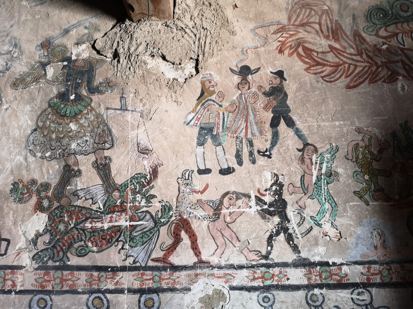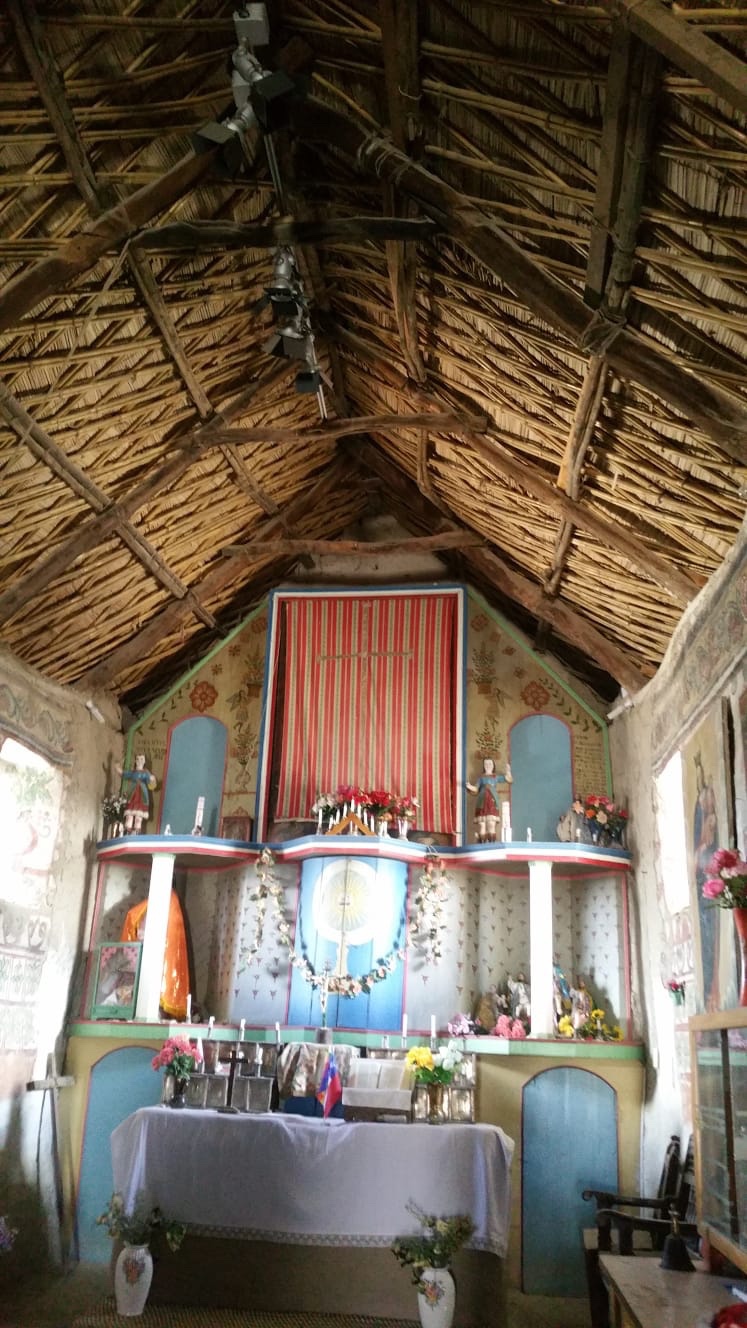 Parinacota : le village dont l’altitude est la plus élevée du Chili, 4400m. Le clocher est comme il se doit séparé du corps de l’église. Cette église du XVI siècle a été décorée par des peintres indiens qui se sont inspirés de leur culture pour représenter le chemin de croixLe Chilien qui détient la clé et a bien voulu nous ouvrir l’eglise et nous expliquer les fresques est l’un des 29 habitants de ce village des hauts plateaux Andins situé sur la route des mines d’argent à 4400 m d’altitude.Les fresques de l’église de Parinacota réalisées peu après l’arrivée des espagnols il y a 500 ans montrent la compréhension étrange de la religion nouvelle des habitants: ici on voit que ce sont les femmes qui sont emmenées en enfer tandis que les hommes regardent depuis le paradisArrivées en enfer elles brûlentPlus étrange encore, Jésus le soir de la cène est représenté avec de la poitrine. Parce que dans la culture Andine, le bien la douceur, l’amour, est associé au feminin et au blanc.Jesus emmené par les espagnols. Il a des mains immenses pour distribuer ses bienfaits avec 6 doigtsEt là, lors de la mise en croix, qui sont les vilains ? Des espagnols ! Reconnaissables à leur belles moustaches et leurs vêtementsMort sur la croix. Les soldats sont en armure comme les espagnols au 16 e siecle