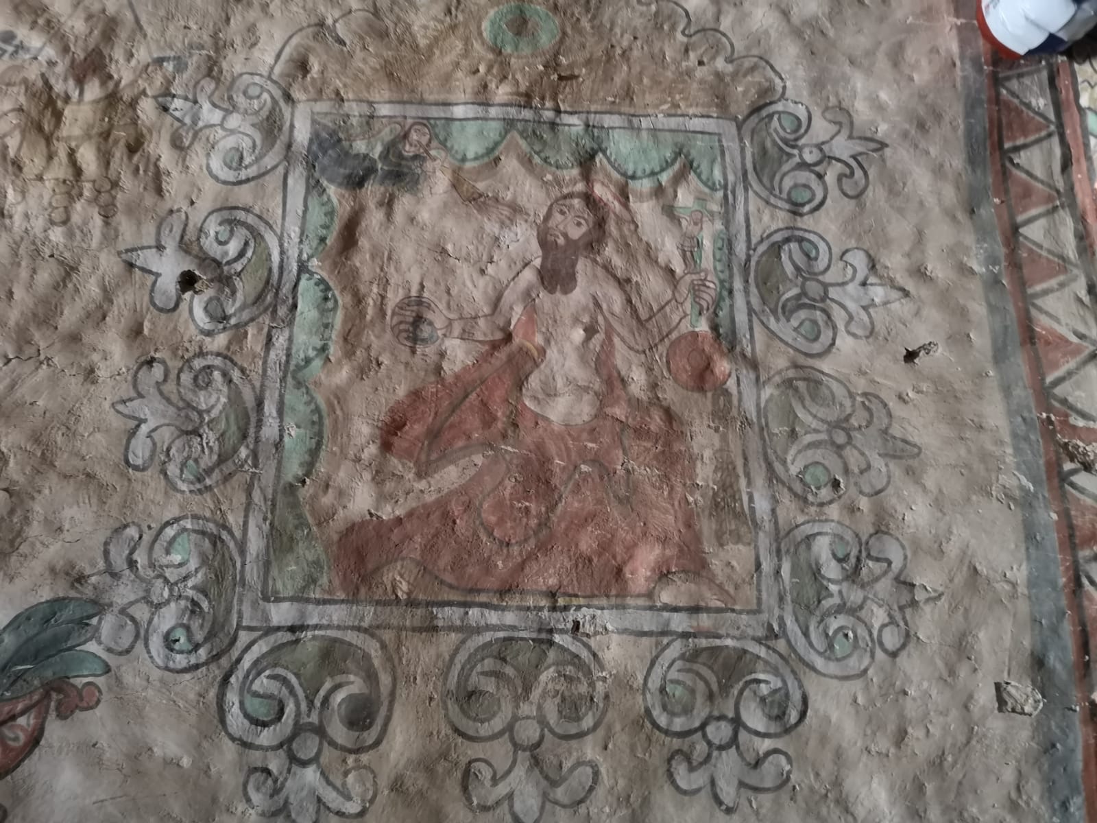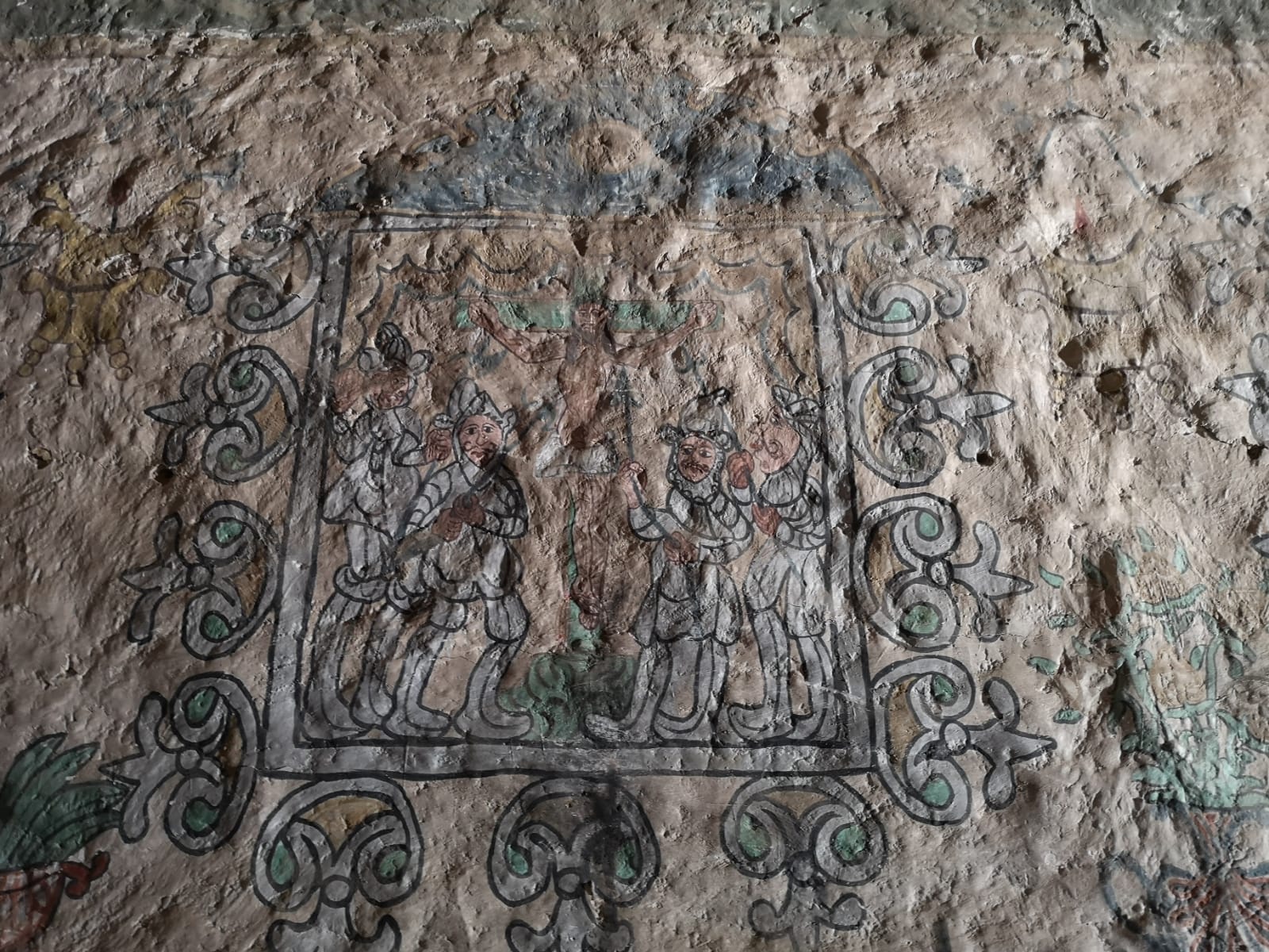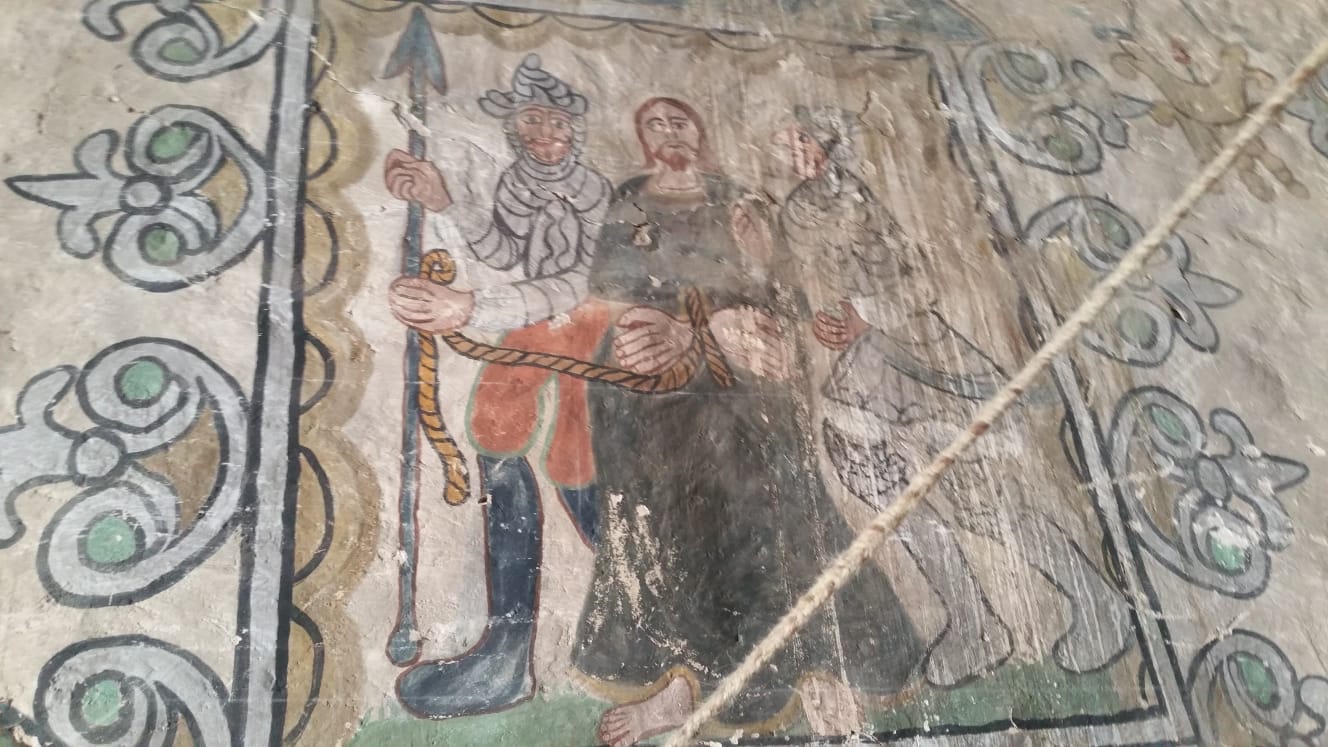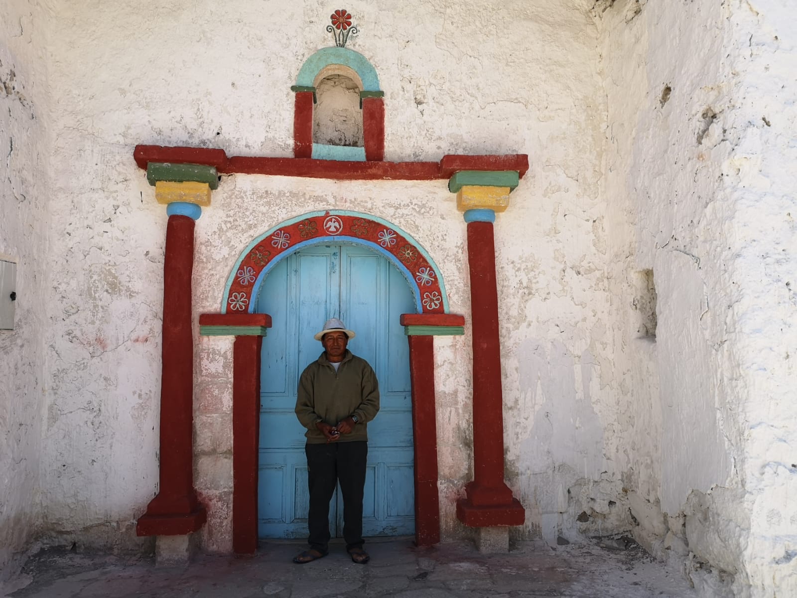 Parinacota : le village dont l’altitude est la plus élevée du Chili, 4400m. Le clocher est comme il se doit séparé du corps de l’église. Cette église du XVI siècle a été décorée par des peintres indiens qui se sont inspirés de leur culture pour représenter le chemin de croixLe Chilien qui détient la clé et a bien voulu nous ouvrir l’eglise et nous expliquer les fresques est l’un des 29 habitants de ce village des hauts plateaux Andins situé sur la route des mines d’argent à 4400 m d’altitude.Les fresques de l’église de Parinacota réalisées peu après l’arrivée des espagnols il y a 500 ans montrent la compréhension étrange de la religion nouvelle des habitants: ici on voit que ce sont les femmes qui sont emmenées en enfer tandis que les hommes regardent depuis le paradisArrivées en enfer elles brûlentPlus étrange encore, Jésus le soir de la cène est représenté avec de la poitrine. Parce que dans la culture Andine, le bien la douceur, l’amour, est associé au feminin et au blanc.Jesus emmené par les espagnols. Il a des mains immenses pour distribuer ses bienfaits avec 6 doigtsEt là, lors de la mise en croix, qui sont les vilains ? Des espagnols ! Reconnaissables à leur belles moustaches et leurs vêtementsMort sur la croix. Les soldats sont en armure comme les espagnols au 16 e siecle