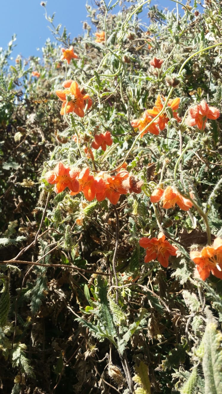 Dans les haies à Putre : cette liane aux fleurs très attractives est couverte de petites épines urticantes est largement représentéePour tenter d’améliorer la rentabilité économique de l’agriculture à Putre et freiner l’exode rural des populations indigènes vers les grandes villes côtières, le gouvernement Chilien investit beaucoup dans les infrastructures : routes, téléphone partout, système d’irrigation, rail. .. Un savoir faire ancestral risque de se perdre