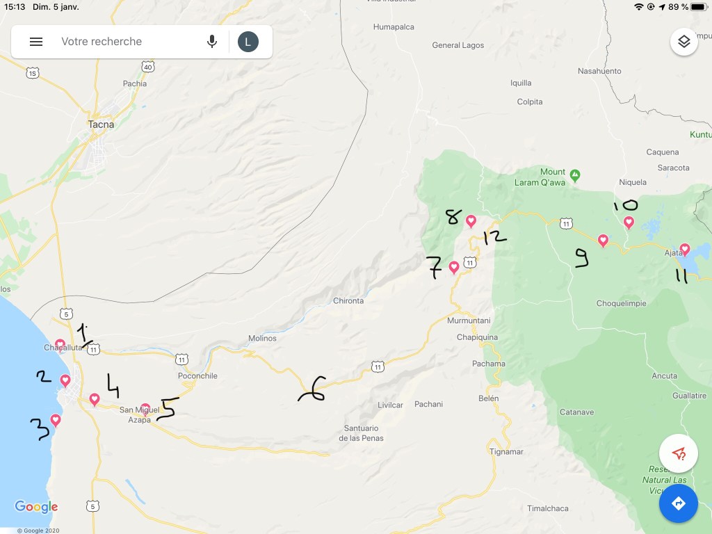 Pour aider à vous y retrouver, j’ai divisé en 10 chapitres chronologiques: chapître 1 : santuaro Lluta Humedal (c’est en bord de mer à l’embouchure du Rio Lluta) chapître 2 : le port de Arica. Chapître 3 : Cuevas (grottes) de Anzota. Chapître 4 : hacienda Gallo. Chapître 5 Geoglyphes de Lluta. Chapître 6 route de Putre. Chapître 7: Socorama. 8 Putre , 9: Parc Lluca. 10: Parinacota Chapître 11: Lac Chingura. Chapître 12 Putre 30 XII