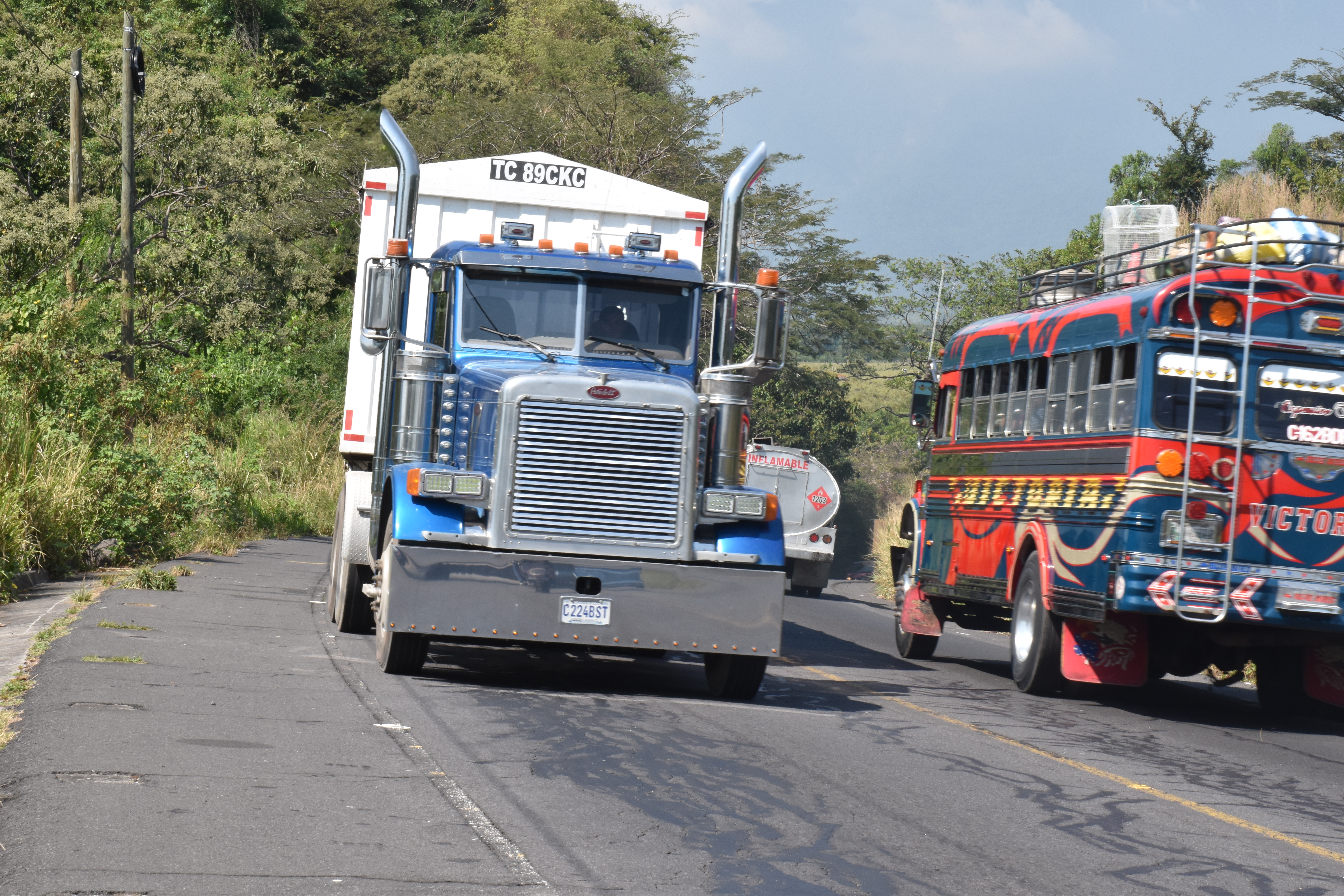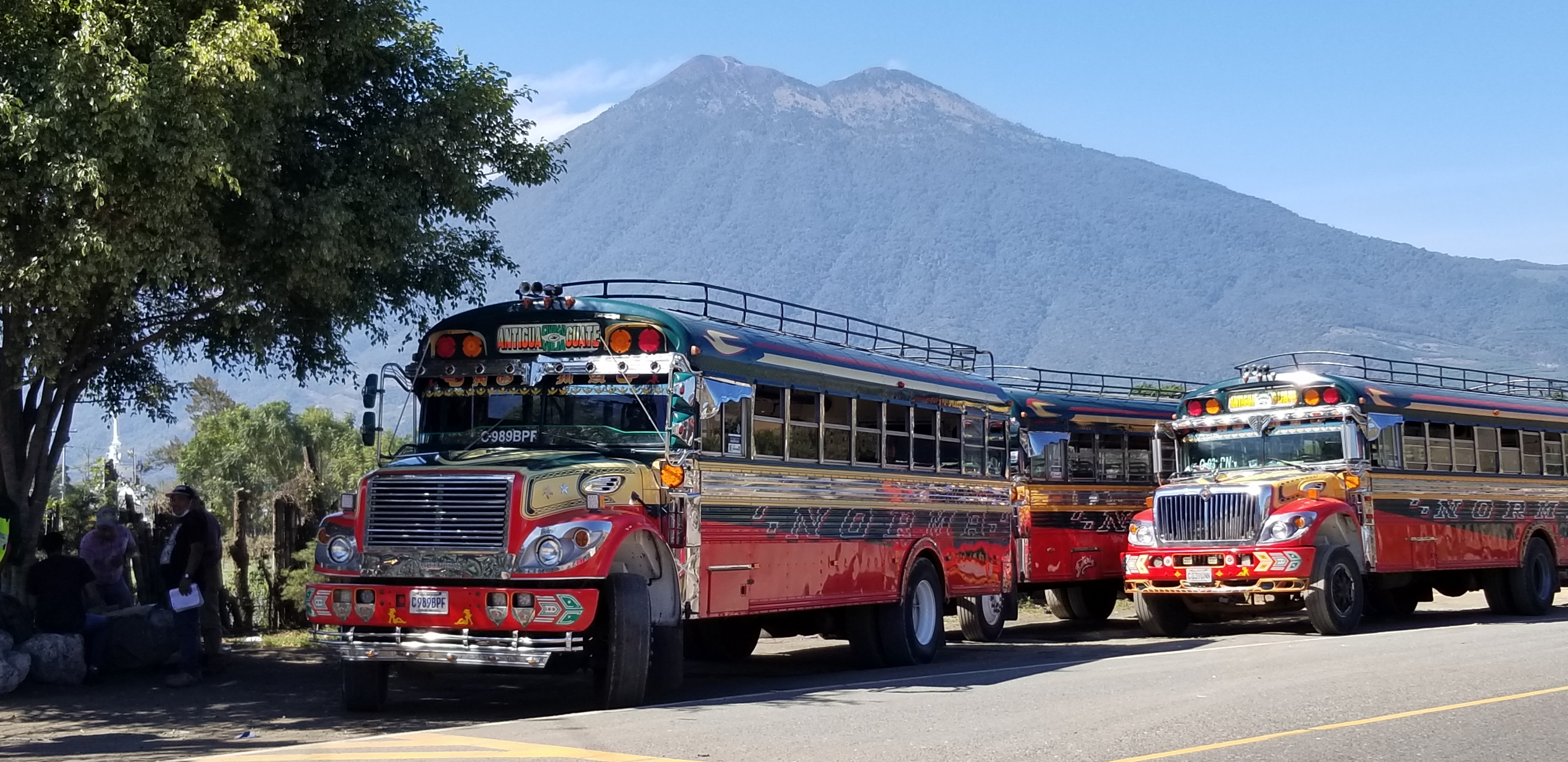 En reprenant la route vers le Pacifique, nous passons près du parking des camionettas . Ces merveilles ont vécu une première vie aux USA et ont été recyclées ici pour le transport des gens qui les utilisent pour aller au marché et en revenir avec des poulets , d’où leur surnom de « chiken bus » . Ils ont été magnifiquement restaurés, et même si les moteurs fument un peu dans les montées, ils tournent toujours, les chromes sont astiqués avec amour et leurs couleurs sont pimpantes.