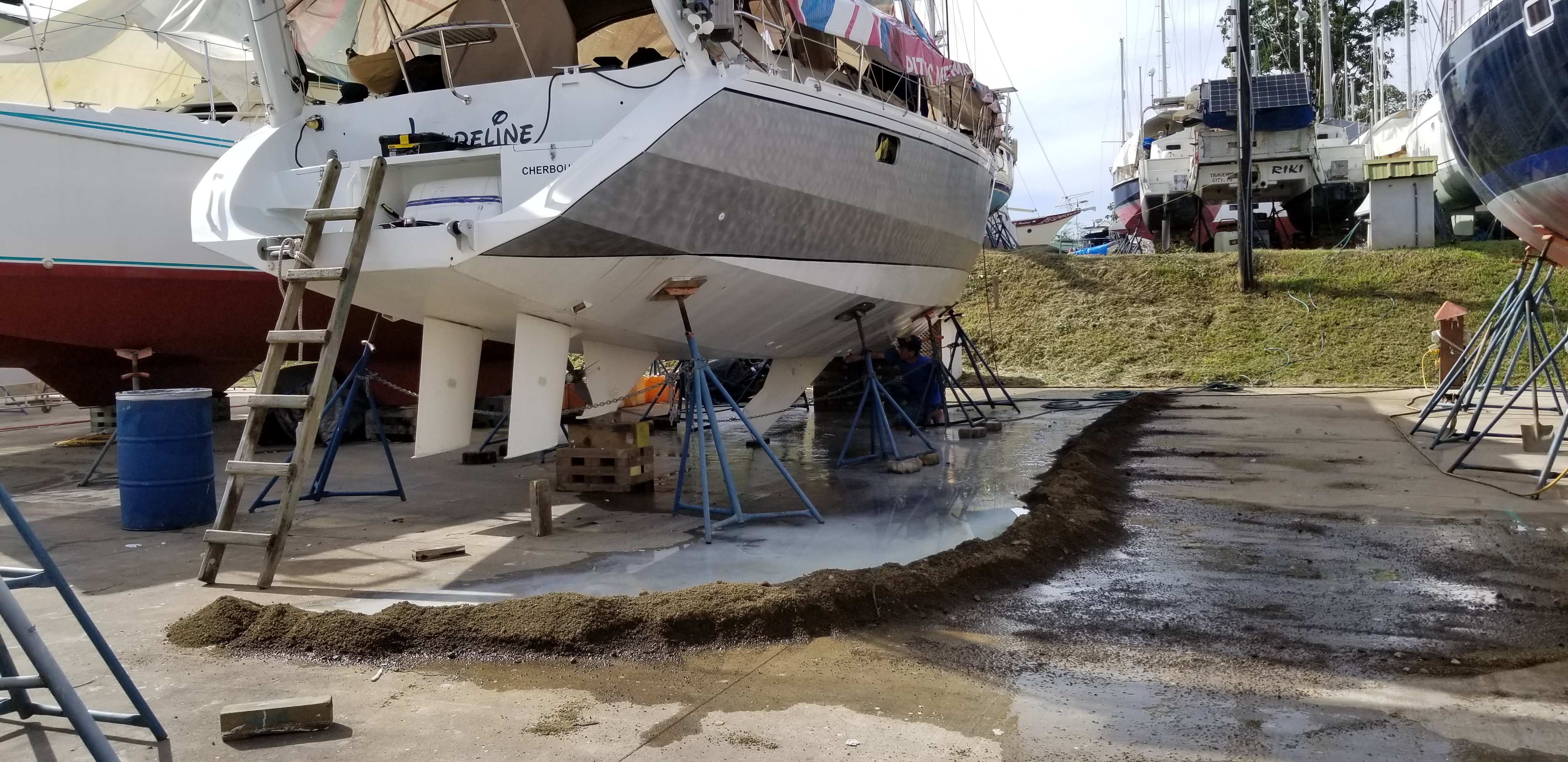 Pour la Laureline, les préparatifs mécaniques et travaux de peinture sont terminés, les bâches qui la recouvraient ont été ôtées, et le séjour sur le béton se termine par un dernier coup de pinceau sur la dérive, alors que le bateau est suspendu dans le travelift.