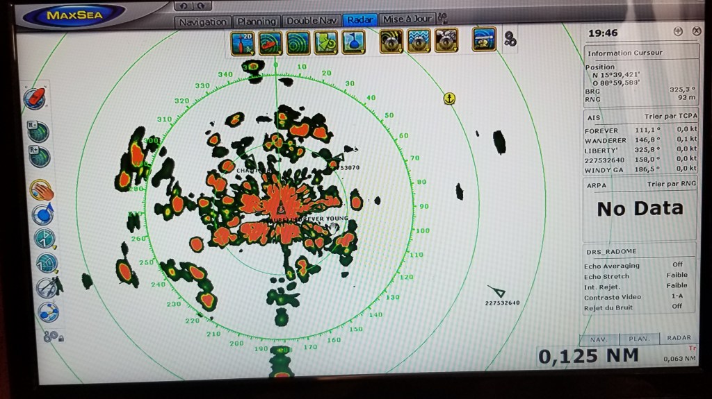 Depuis quelques temps avant notre arrivée à Rio Dulce, le radar était en panne; la vigilance seule du barreur a permis de repérer à vue les nombreux petits bateaux de pêche perdus la nuit au large des côtes d’amérique du sud.