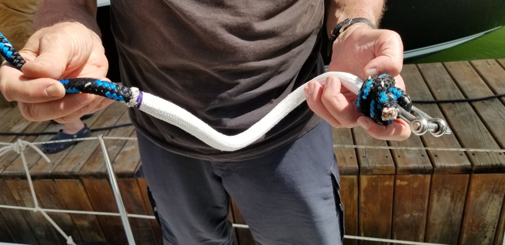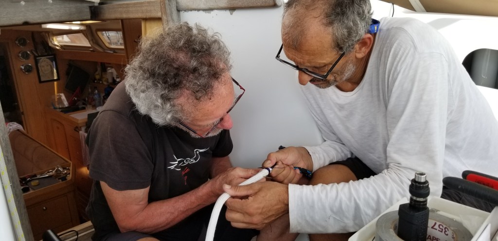 De nouvelles drisses et bosses de ris faisaient aussi partie de nos bagages pour remplacer les manœuvres trop usées par la navigation vigoureuse du grand Sud et le soleil tropical.