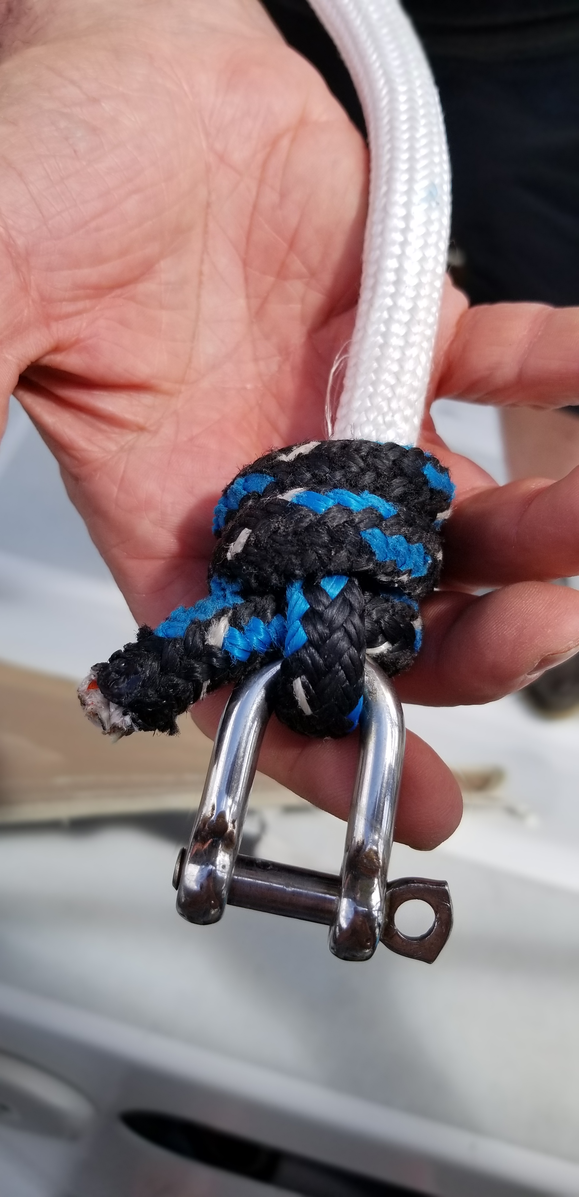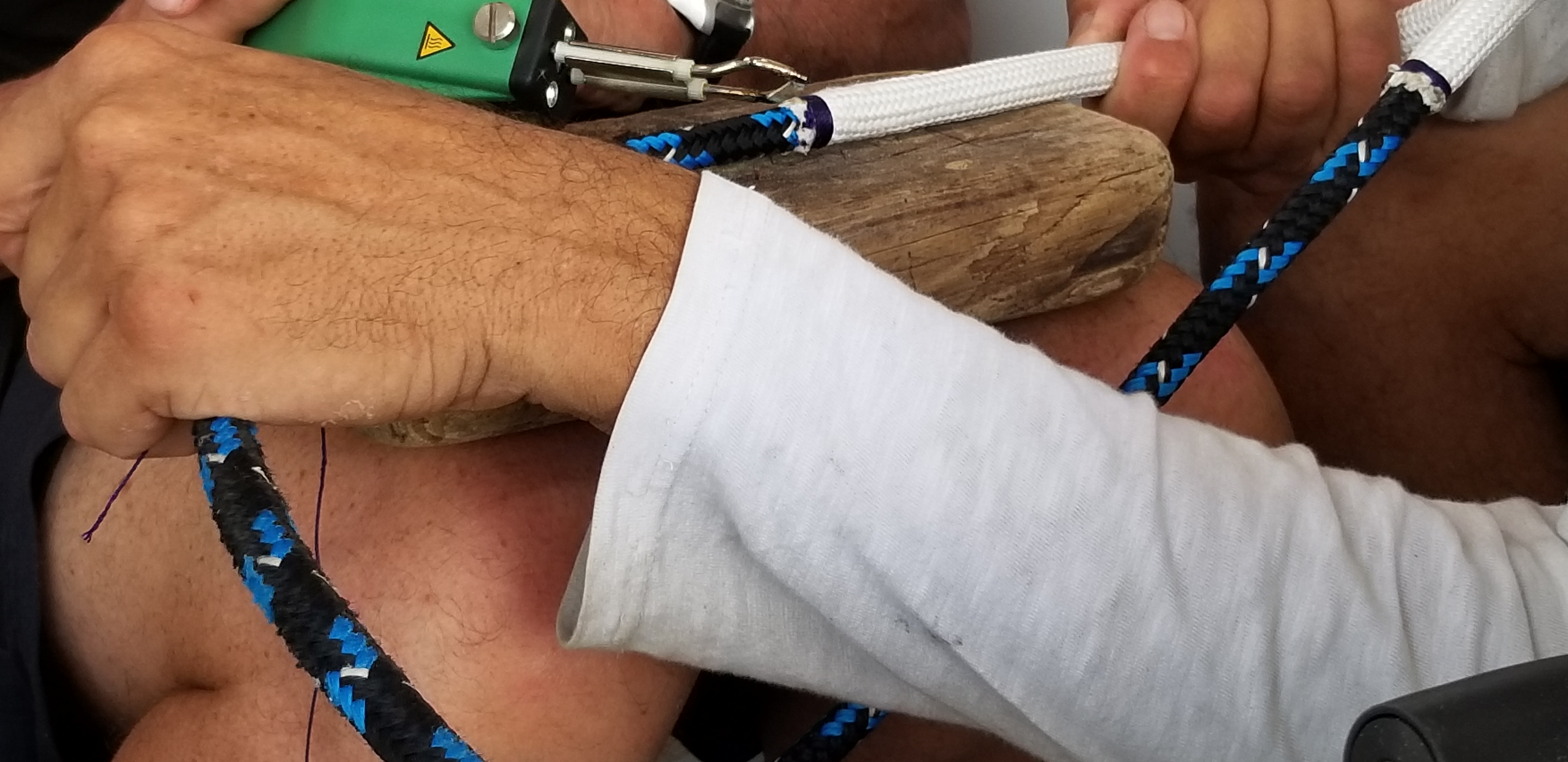 Marc et Manu préparent la nouvelle drisse du yankee. Son extrémité est sur- gainée de dyneema pour empêcher l’usure par ragage sur le réa de poulie en tête de mât, avant de fixer une manille par un nœud de capucin.