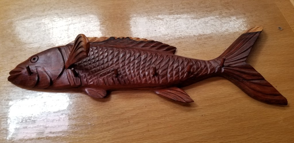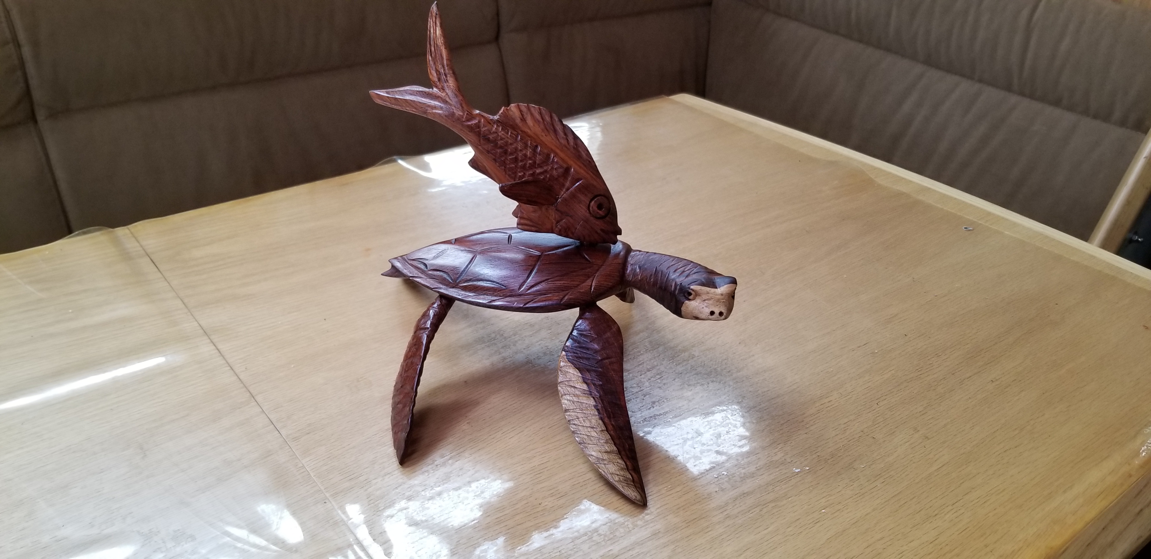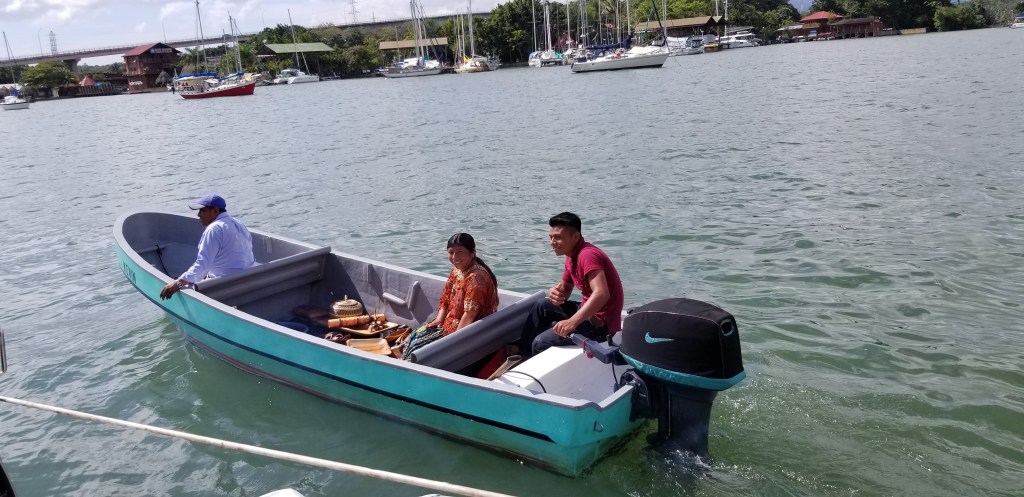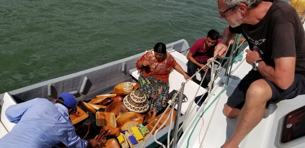 C’est le moment que choisit une petite famille d’artisans mayas, qui viennent apporter leurs créations d’objets en bois de rossul. La tentation est trop forte pour ne pas y succomber et l’équipement du bord est désormais complété d’une tortue qui se fait nettoyer le dos par un poisson, et d’un poisson porte-cuilleres..