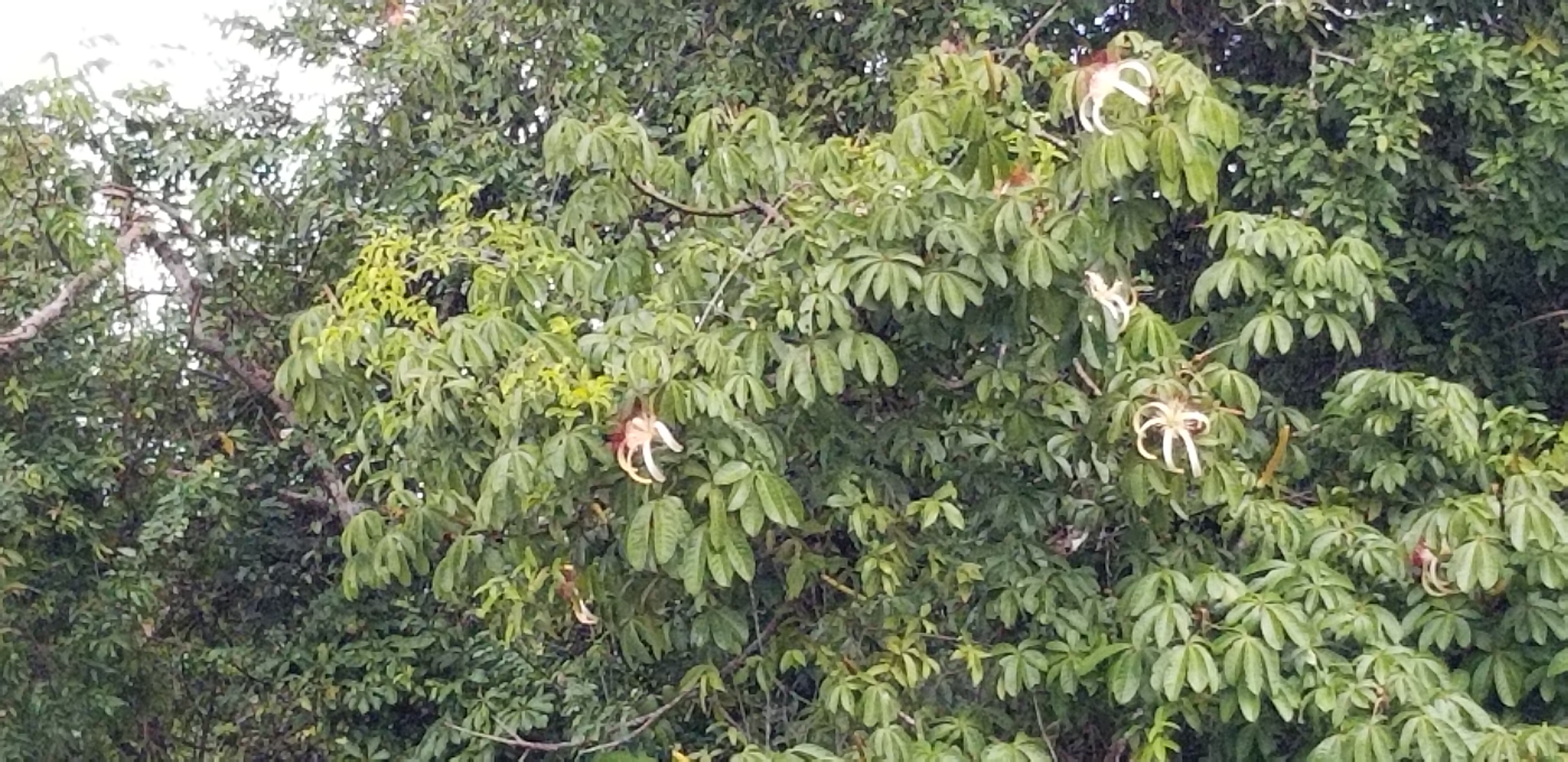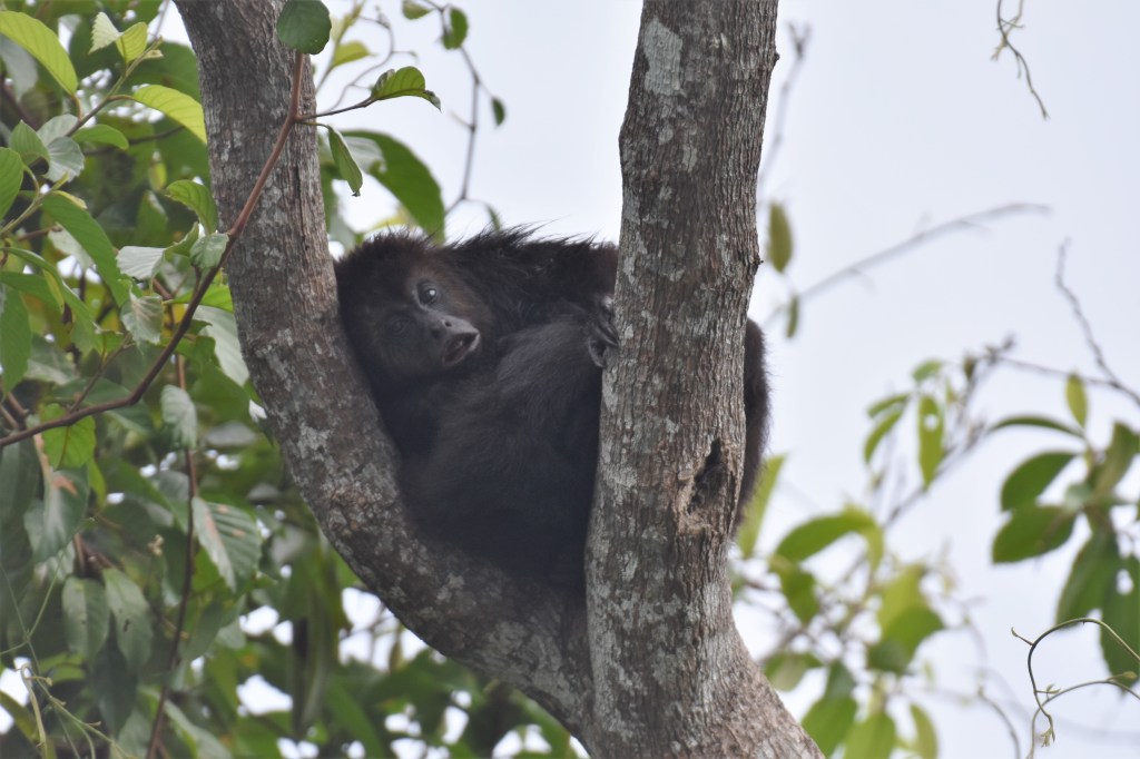 Rapidement des formes noires apparaissent, enroulées en boule en haut des arbres ; ce sont des singes hurleurs, silencieux et immobiles, encore transis et mouillés par les averses denses de la nuit et du début de la journée.