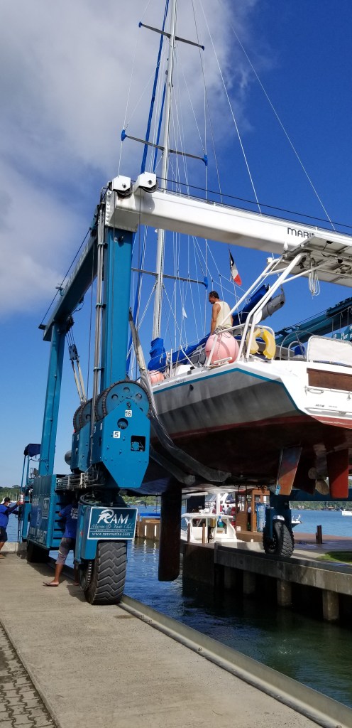 Lorsque revient la saison sèche, les bateaux se peuplent de leurs équipages et ils doivent attendre leur tour pour être remis à l’eau par le travelift, avant de reprendre la route et les alizés.