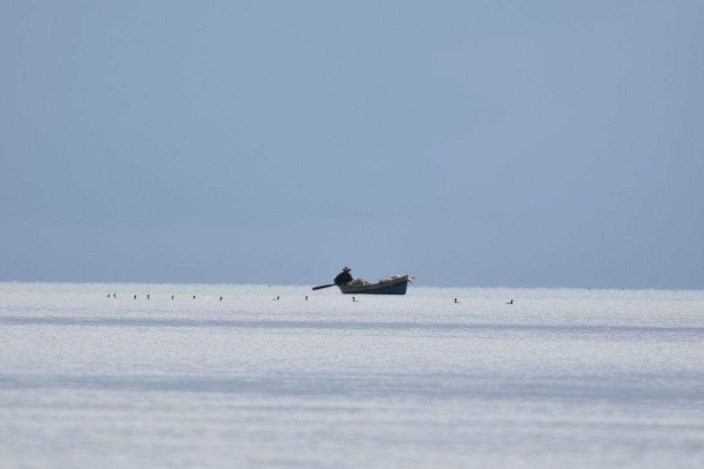 Des pêcheurs sont au travail dans des pirogues creusées dans des troncs d’arbre, parfois des barques en fibre. Des pélicans par groupes de 2 ou 3 volent en rase-motte et quand ils repèrent un filet qu’on relève, ils amerissent, relèvent le cou et, l’air très dignes, s’approchent doucement du pêcheur en équilibre fragile sur son esquif, l’air de dire « vos papiers s’il vous plaît «