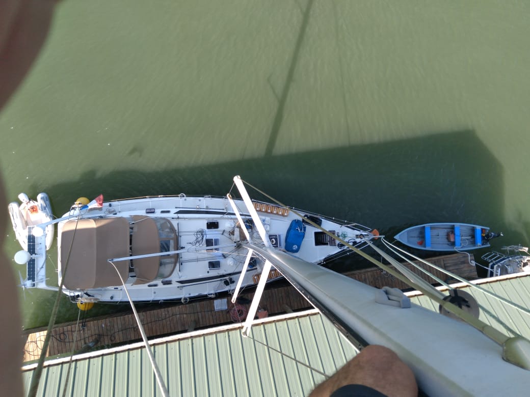 Ça n’a d’ailleurs pas loupé. L’un des « messagers » a cassé. Ces cordelettes fines et longues qui sont laissées dans le mât lors du démontage des drisses, n’ont en principe rien de bien difficile à faire…si ce n’est de rester en un seul morceau. La tendance est donc de les réutiliser d’une année sur l’autre, d’autant qu’elles sont à bonne longueur. Mais c’est sans compter sur la chaleur et la lumière tropicales. Un messager a cuit dans le mât et il en est ressorti en poussières sur une bonne partie de sa longueur. Il fallait donc aller chercher la haut le bout qui tenait encore à peu près pour pouvoir remettre en place la drisse.
