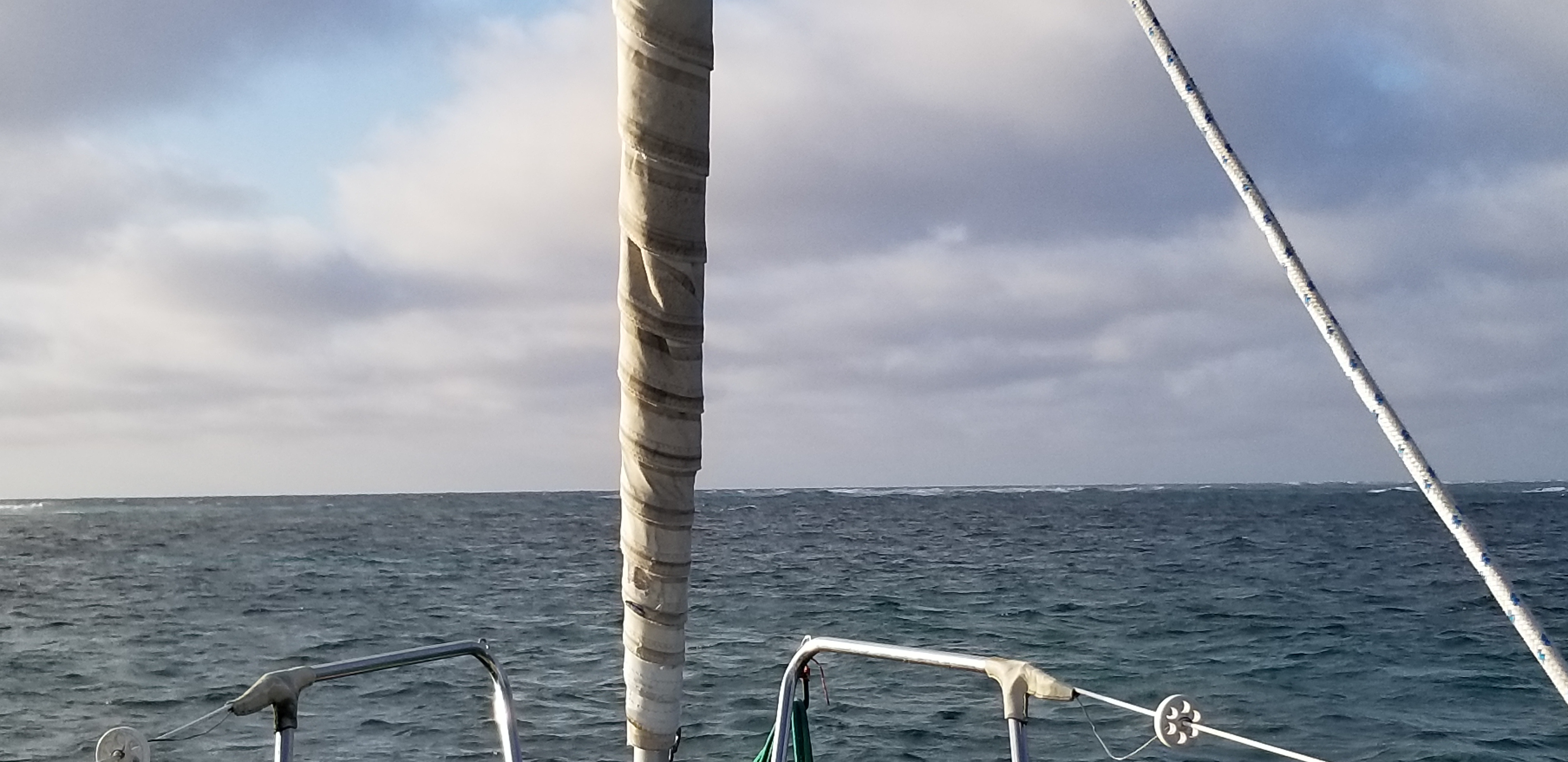 En sortant du zigzag au milieu des brisants, La Laureline bondit dans la houle qui se précipite dans la passe puis très vite les fonds se perdent dans les abysses. Le bateau retrouve les alizés maintenant solidement établis, le barreur reprend le vent tandis que le génois est déployé. Cap au Nord Nord-est