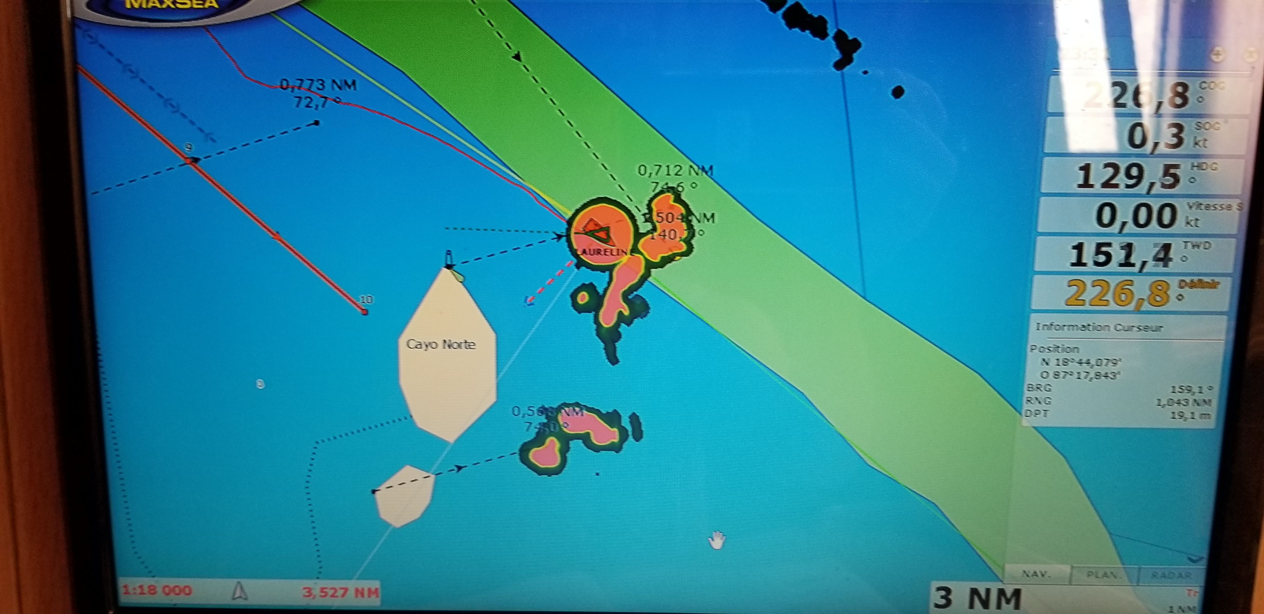 L’option retenue est donc de pénétrer entre les îlots protégés de la houle par la barrière de corail, en arborant dans les haubans le drapeau du Bélize et le pavillon jaune Q pour quarantaine, AIS et VHF allumés, voiles hautes. Le dinghy est ficelé sur le portique, pour signifier clairement que l’équipage est à bord.