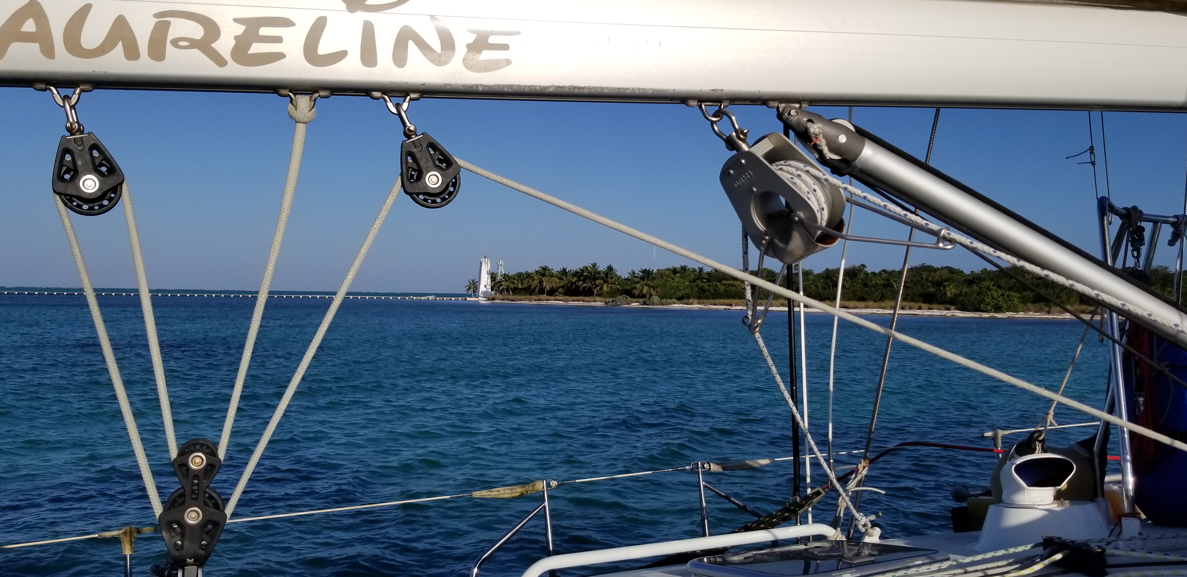 Vers 16 heures, elle entrait dans la passe nord de l’atoll corallien de Chinchorro bank, pour aller jeter l’ancre dans du sable devant le phare blanc de Cayo Norte.