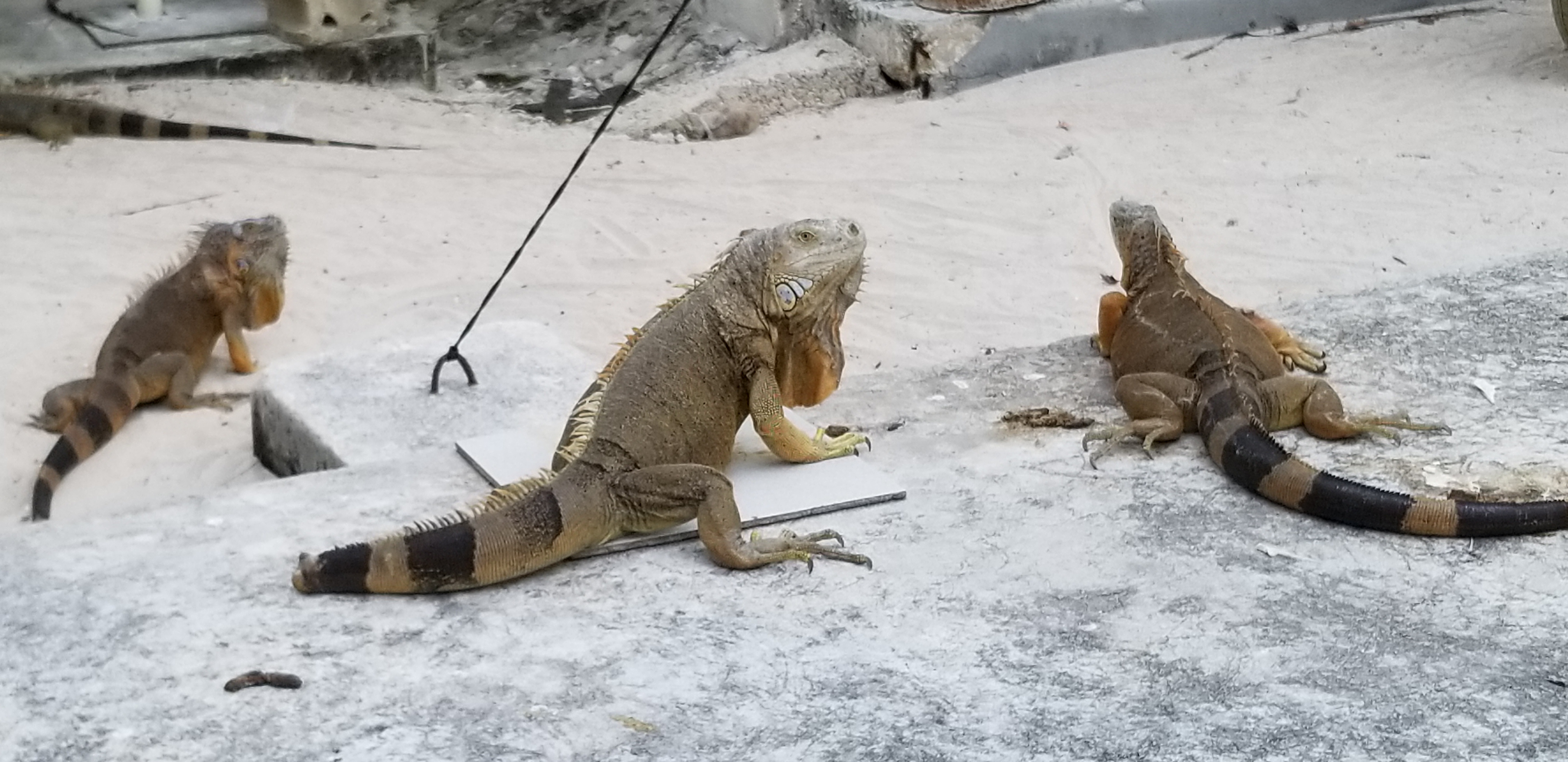 Le bâtiment est construit pour résister à un cyclone, en béton armé recouvert d’un parement beige, des volets en accordéon sont cadenassés en-cas de cyclone. Dans le jardin, une flopée d’iguanes se prélassent sur une dalle bétonnée et attendent manifestement les épluchures de légumes et des restes de table.