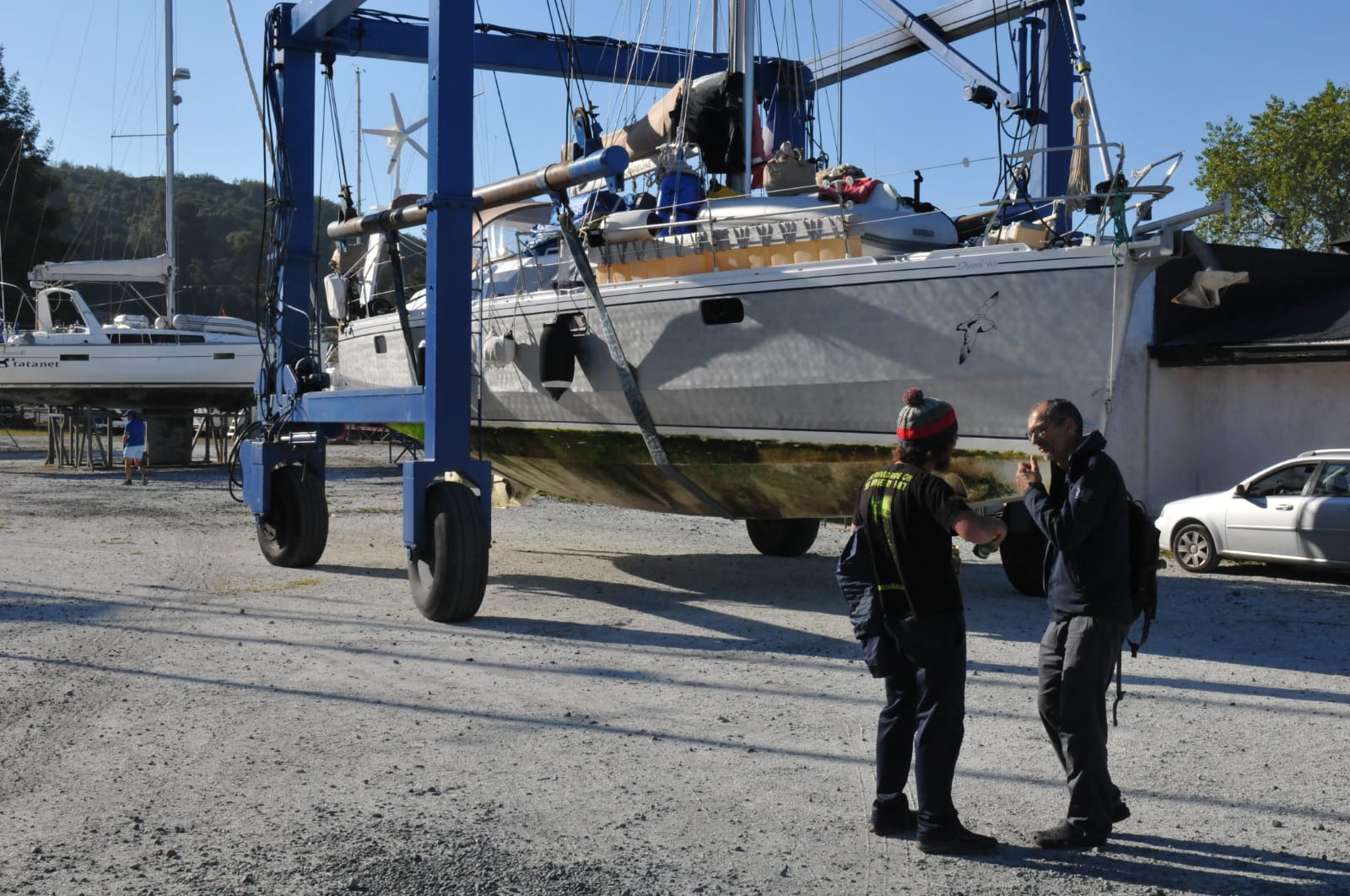 Emmanuel profite des compétences de Marc pour vérifier l’état du bateau et comprendre les mésaventures rencontrées cette année, alors que le bateau a régulièrement été confié pour hivernage à Cherbourg, ou il a été livré en 2013.
