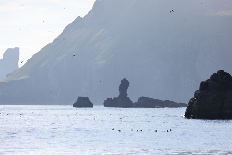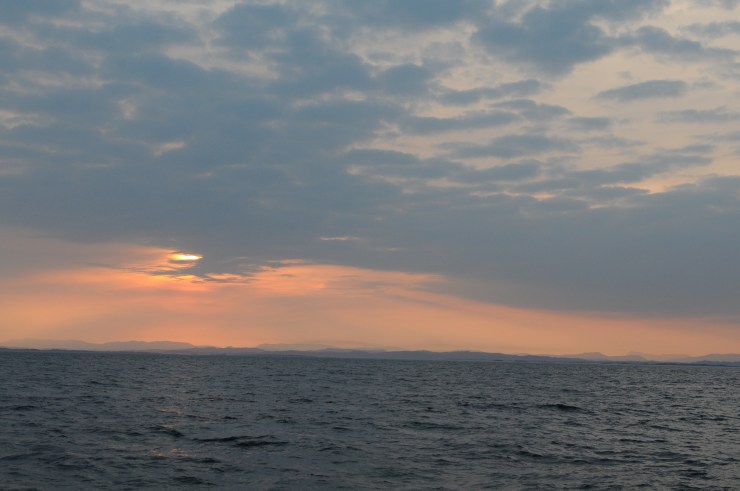 « Vent nul, progression au moteur en direction de Fair Isle. Clarté résiduelle pendant la nuit qui ne dure que quelques heures. Dauphins, fous de bassn, petrels, guillemots«