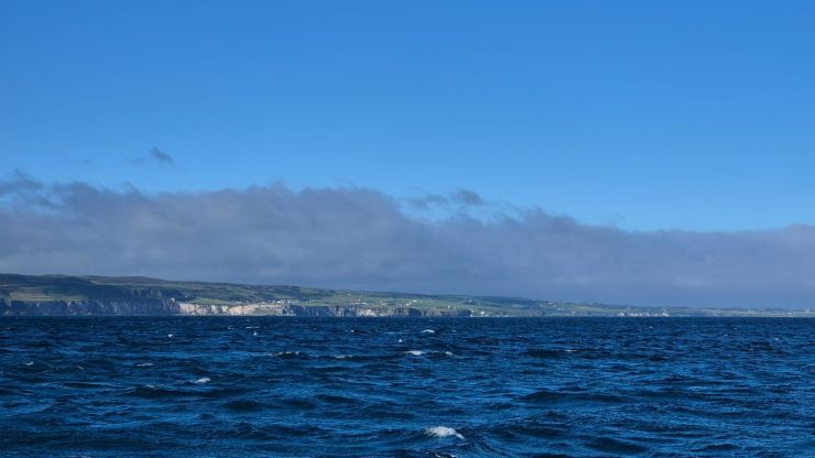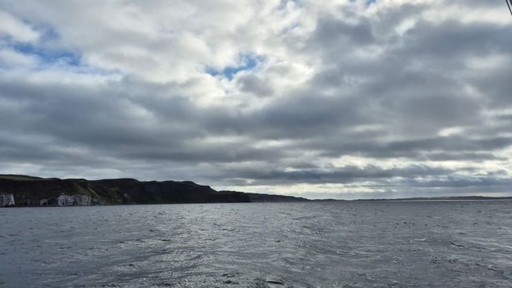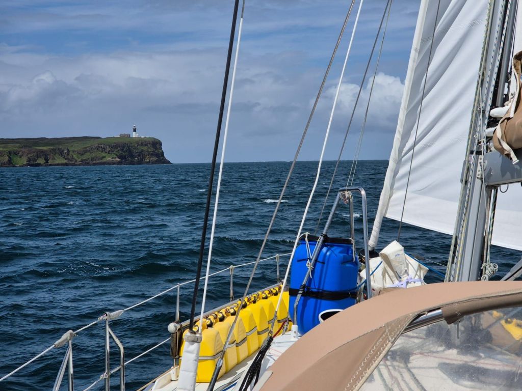 L’apparition de plages de lumière dans le ciel nuageux et rafaleux des Hébrides, la remontée du baromètre, les rafales elles même, sont la triade signature de l’arrivée imminente du front froid, avec rotation du vent à l’Ouest. Dans cette perspective, il a été jugé préférable de ne pas s’arrêter à Port Ellen, ou la Laureline se serait trouvée piégée par la violence du vent. Traversée donc vers Rathlin, au Nord de l’Irlande, puis tourner autour de l’île et apercevoir la chaussée des géants, puis récupérer le vents d’ouest et descendre vers l’île de Man et la Mer d’Irlande.