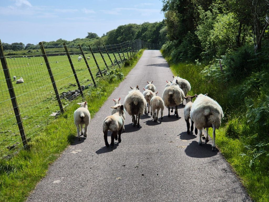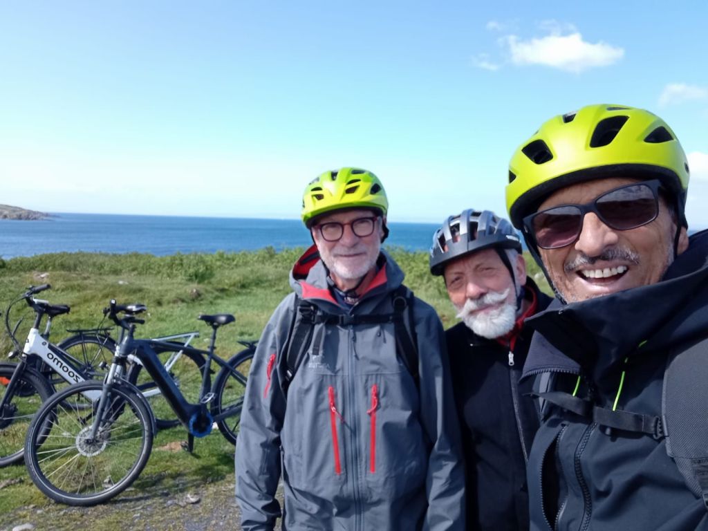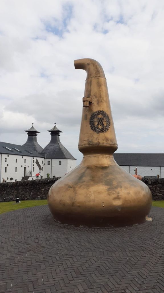 « La balade à vélo électrique le long de la côte de Islay passe devant trois des neuf distilleries de whisky de Islay: Laphroaig, Lagavulin et Ardbeg puis conduit par une route étroite à une voie à travers bosquets de hêtres, rhododendrons géants, collines, plages de sables fin et de galets, fréquentés par les guillemots à miroir, huitriers pie, faisans, jusqu’à la croix celtique de Kildalton, construite au VIIIe siècle, après la christianisation de l’Ecosse, où l’on distingue encore des scènes de la bible : la main levée d’Abraham sur son fils, David tuant un lion, Cain et Abel, et des serpents.