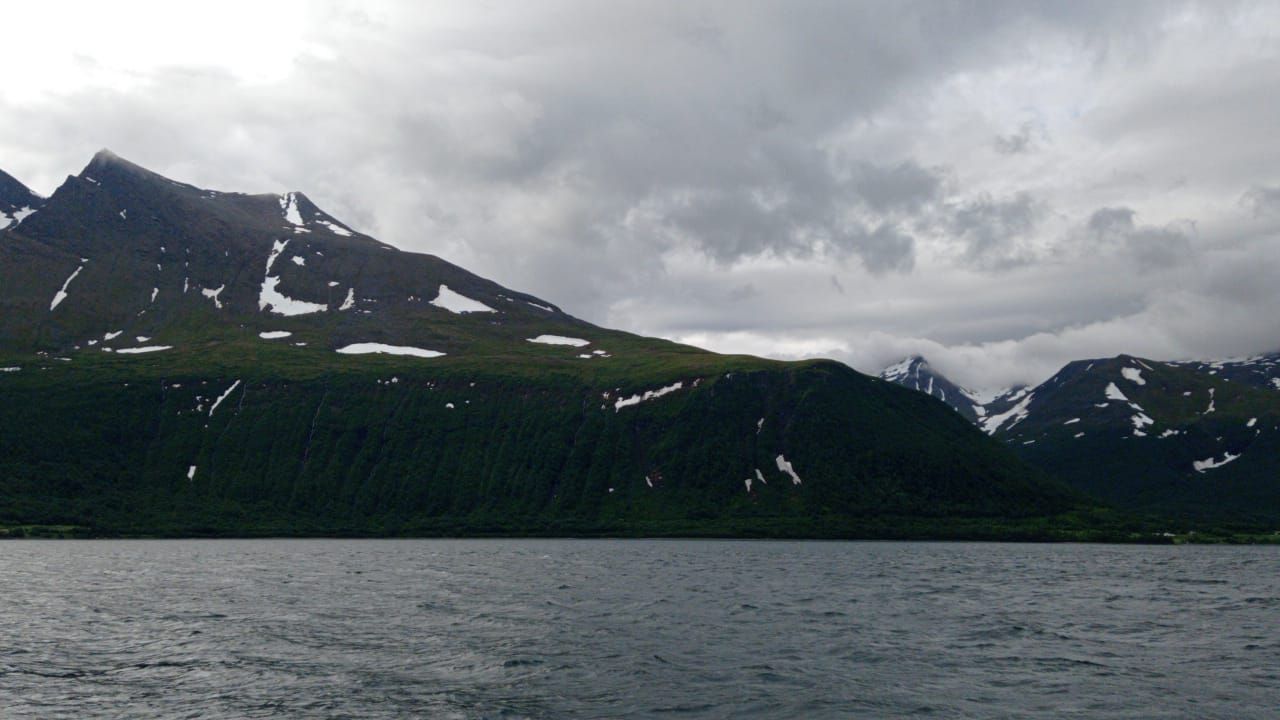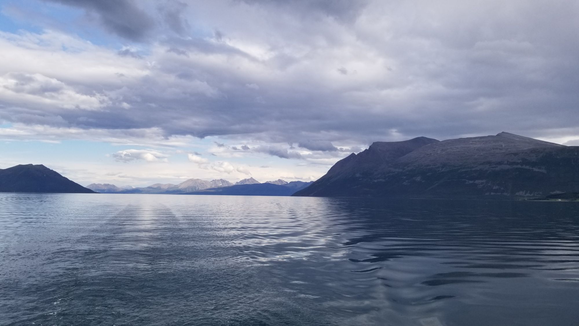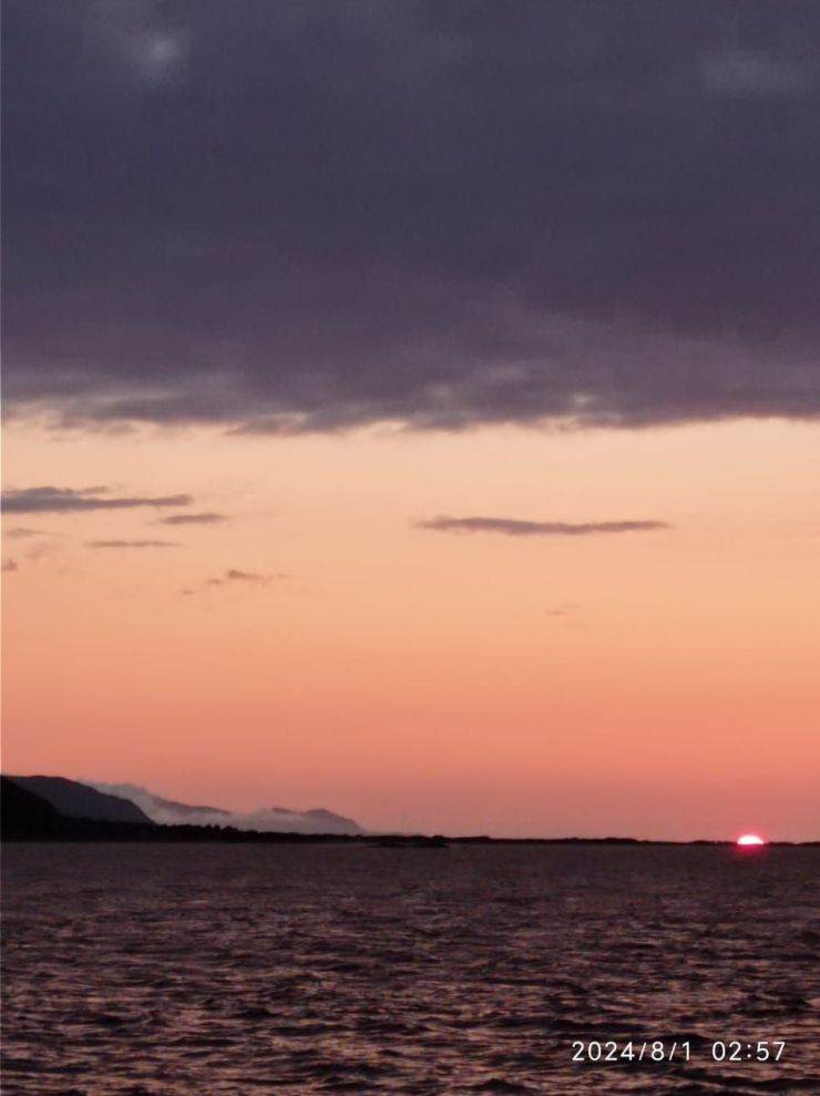 « La rotation des quarts entre les trois équipiers s’effectue toutes les trois heures la nuit et toutes les quatre heures le jour. Ce matin à 5 heures après une belle nuit à la voile au près bon plein par vent de NE à 20-25 kt, le vent est tombé, la mer a repris son calme avec légère houle, le génois a été enroulé, la GV est restée arisée, le Volvo mis en marche à 1650 tours/mn, en route au Nord Est à petite vitesse, plus lentement en tout cas qu’à la voile. Sous un doux lever de soleil sans vent, Les montagnes enneigées de la Norvège sont en vue. A leurs pieds la mer semble fumer, en donnant une brume aux formes fantasmagoriques et juste au dessus à faible hauteur un nuage enroulé rond comme un boyau une écharpe, un boa, qui stationne à faible altitude, en laissant dégagé la partie haute des pentes abruptes. Le contraste des eaux chaudes d’origine tropicales amenées par le gulf stream sur une terre un peu froide est sans doute pour quelque chose dans ce joli spectacle surprenant. »