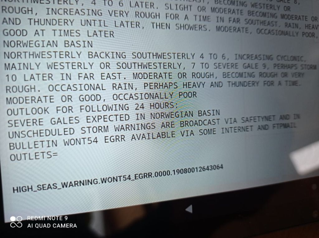 un bulletin météo spécial est annoncé ensuite, force 10 « high see warning ». Le vent monte et la pression baisse, il faut chercher un abri en courant devant. L’équipage amène le bateau à l’abri des lofoten, vent portant, cap nord est 40. Suppression de la voile avant.