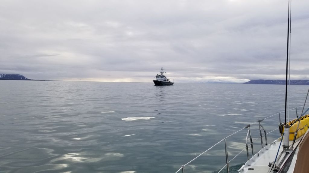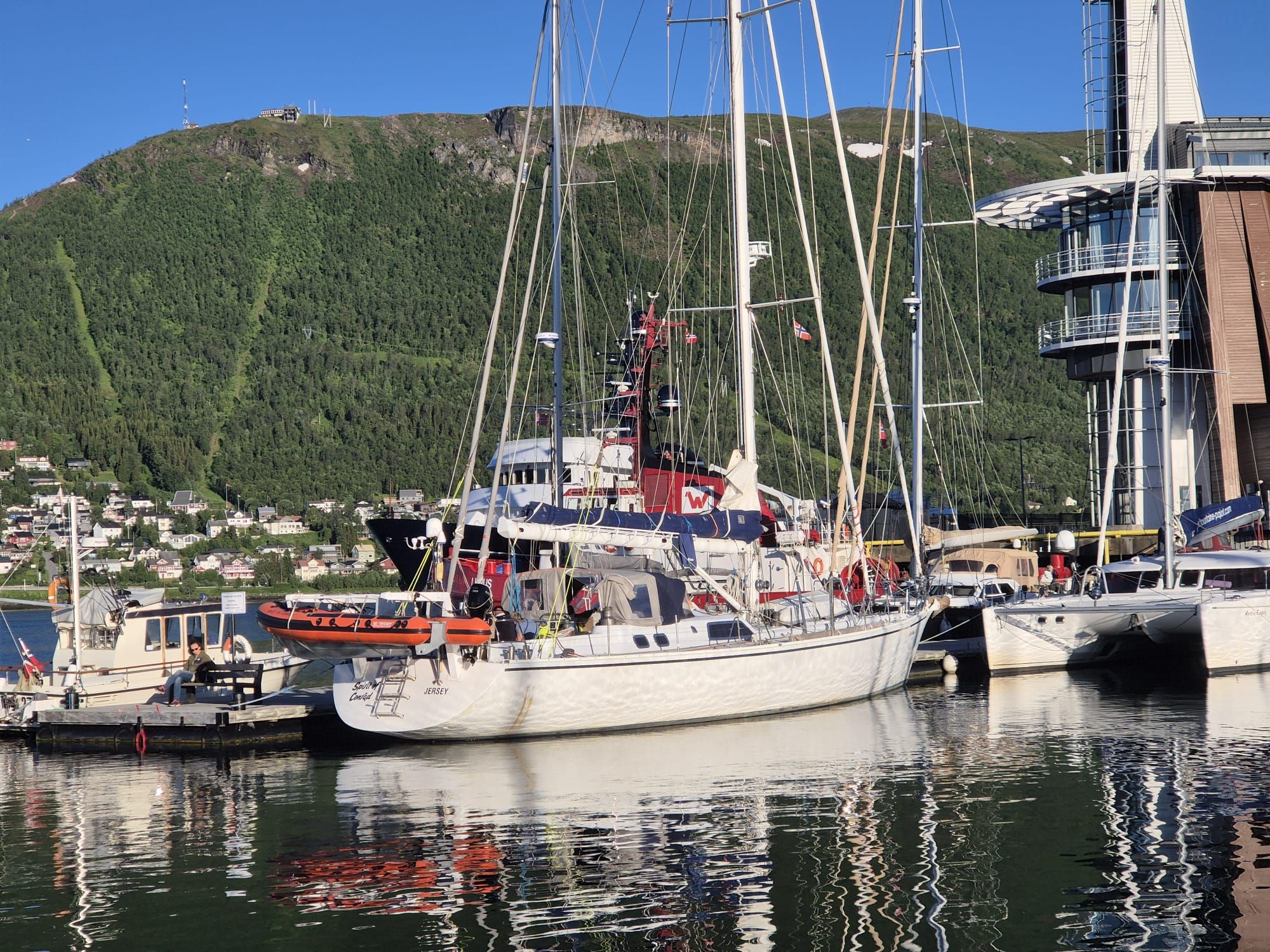 Accueil chaleureux de l’équipage par la police Norvégienne … « vous nous avez amené le vent du Sud et du soleil ! » après une route entièrement au près dans le vent du Nord depuis bientôt 3 semaines, cette bonne volonté météorologique ne se refuse pas.