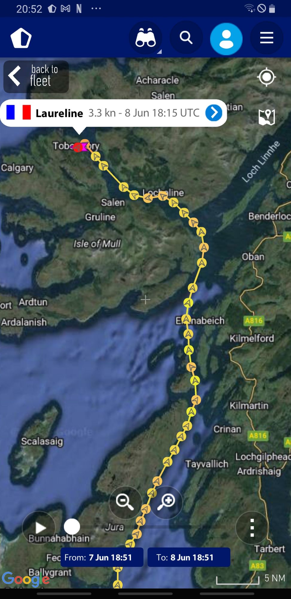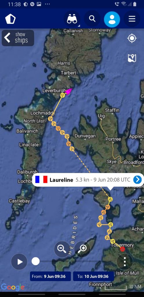 vitesse: 5,4 kt. Remontée laborieuse hier contre vent et courants de marée sous averses de pluie et de grêle, escale de 12h à Tobermory, la fenêtre étant un peu meilleure aujourd’hui, avec petite baston prévue pour accueillir la Laureline demain soir à Stornoway si tout va bien. »