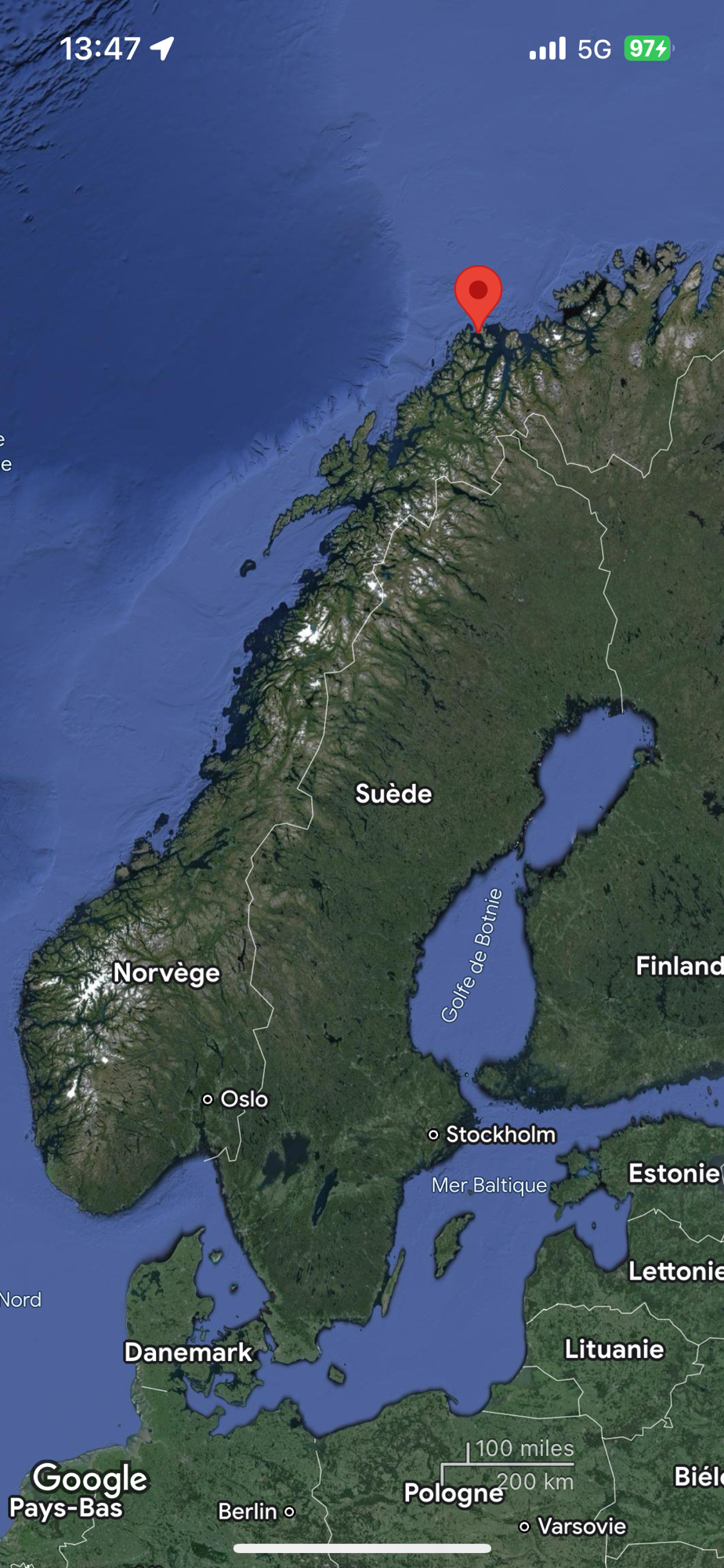 Lat+66.942800 Lon+12.171500 « Conscients du BMS en cours au Sud de notre zone. On garde de la vitesse route 40 jusqu aux fjords abrits. »