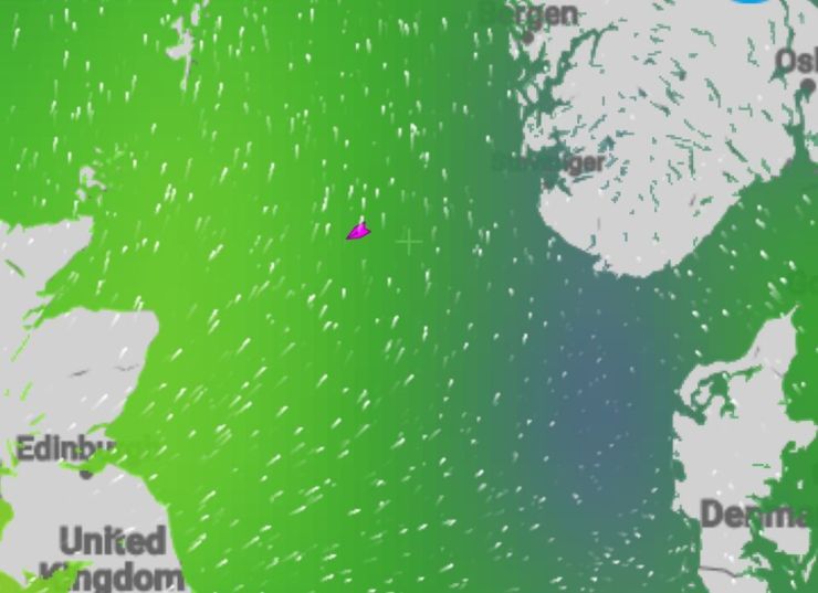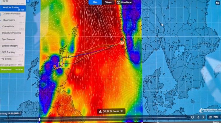 Question météo, deux dépressions au large de l’Ecosse se dirigent vers la Norvège en donnant pour le moment du sud (de face) pendant une douzaine d’heures, en mollissant, mouvement qui devrait permettre d’aller récolter ensuite (aux alentours du North passage) le front froid et son vent d’ouest (porteur pour aller au sud), suivi de la dorsale anticyclonique qui devrait offrir son vent porteur entre l’Irlande et l’Angleterre si Eole tient ses promesses.