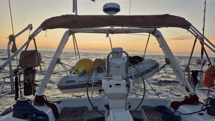 Il a fallu prendre deux ris en soirée, puis passer au moteur quand le vent est tombé vers minuit. La production d’électricité par les alternateurs a été mise à profit pour remplir les 250 litres de la cuve d’eau bâbord avec le désalinisateur.